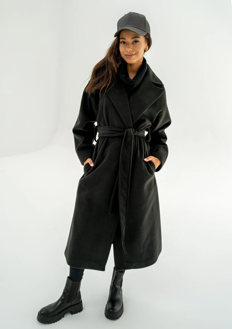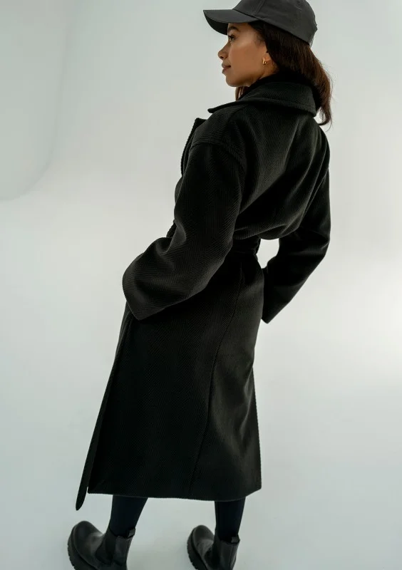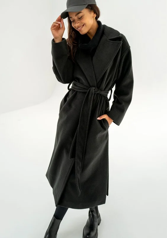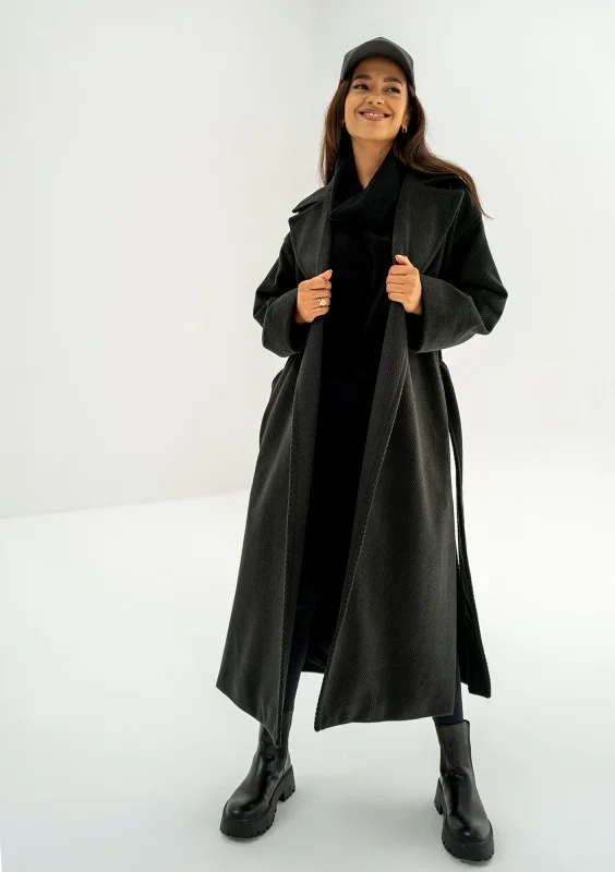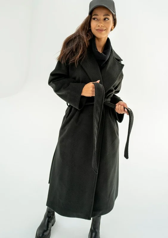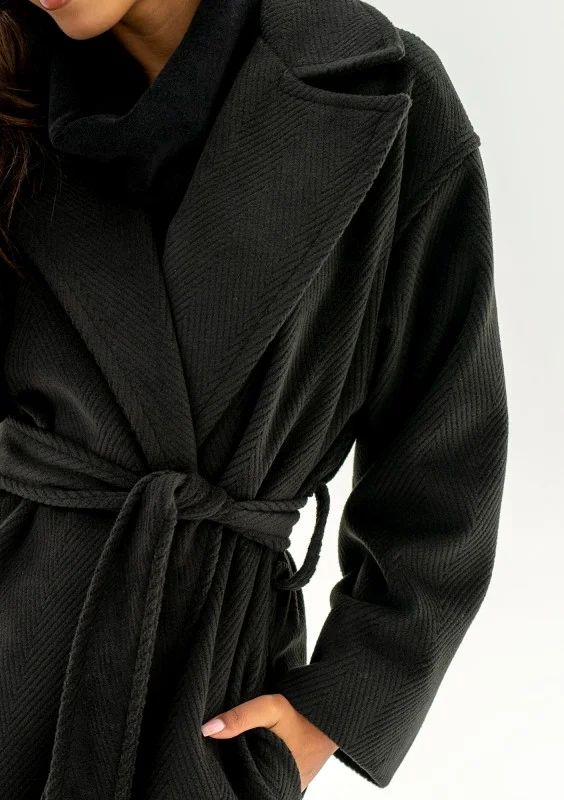 Czarny płaszcz damski z paskiem to pełnia minimalizmu i ponadczasowej elegancji. Ten prosty model zapewni Ci zawsze udany look. Salve posiada fakturę jodełki, wykonany został z ciepłej dzianiny. Idealnie sprawdzi się jesienią i w cieplejsze, zimowe dni.