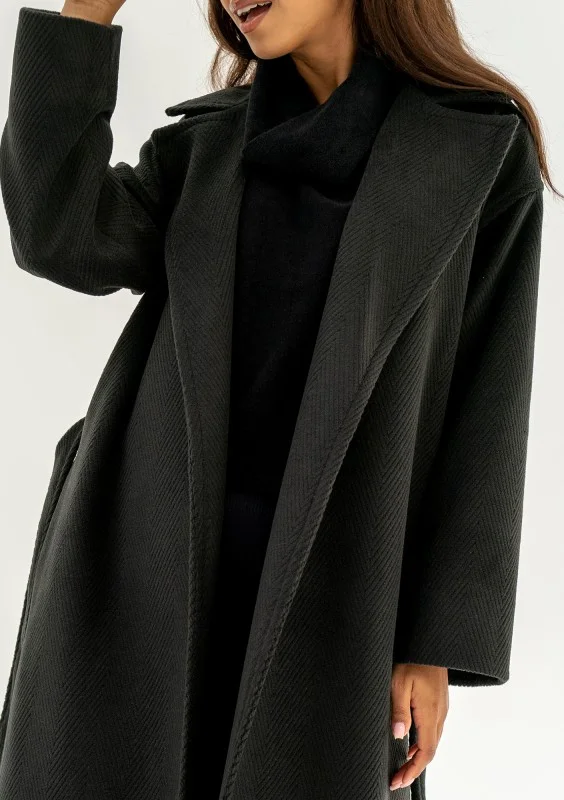 Elegancki płaszcz damski na jesienną pogodę, zachowany w ponadczasowym stylu. Model czarny, z delikatną fakturą jodełki i podszewką.
