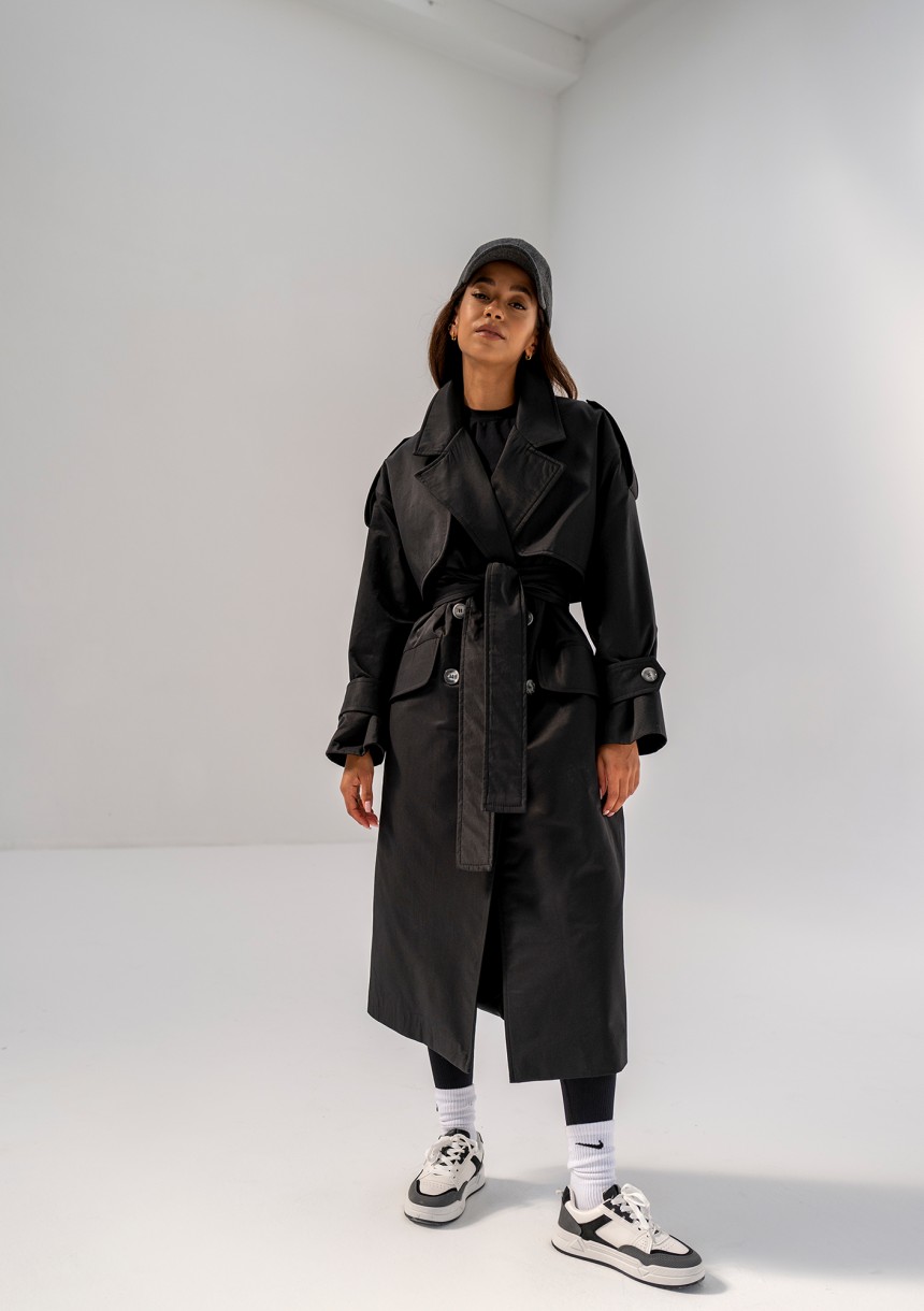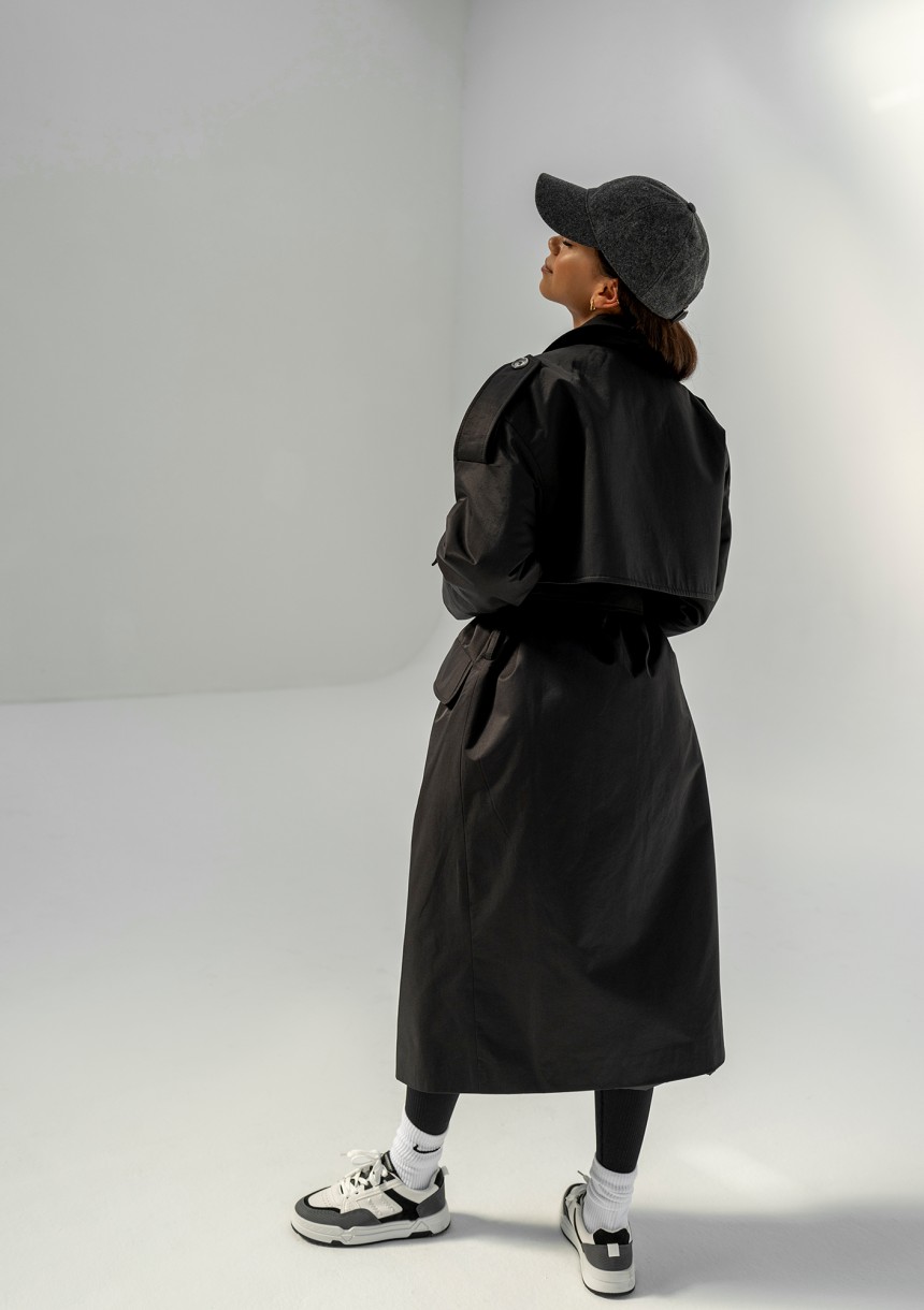 Czarny trencz damski idealnie sprawdzi się w okresie przejściowym. Lekki i praktyczny, stanowi eleganckie dopełnienie codziennego ubioru. Do sukienki, spodni, a nawet sportowych stylizacji dresowych: wpisze się w każdą kombinację. Płaszcz dwurzędowy zdobią liczne detale kroju. Na stylowy efekt pracują podpinane mankiety i designerskie klapy przy dekolcie. Dopełnia go pasek oraz praktyczne kieszenie.