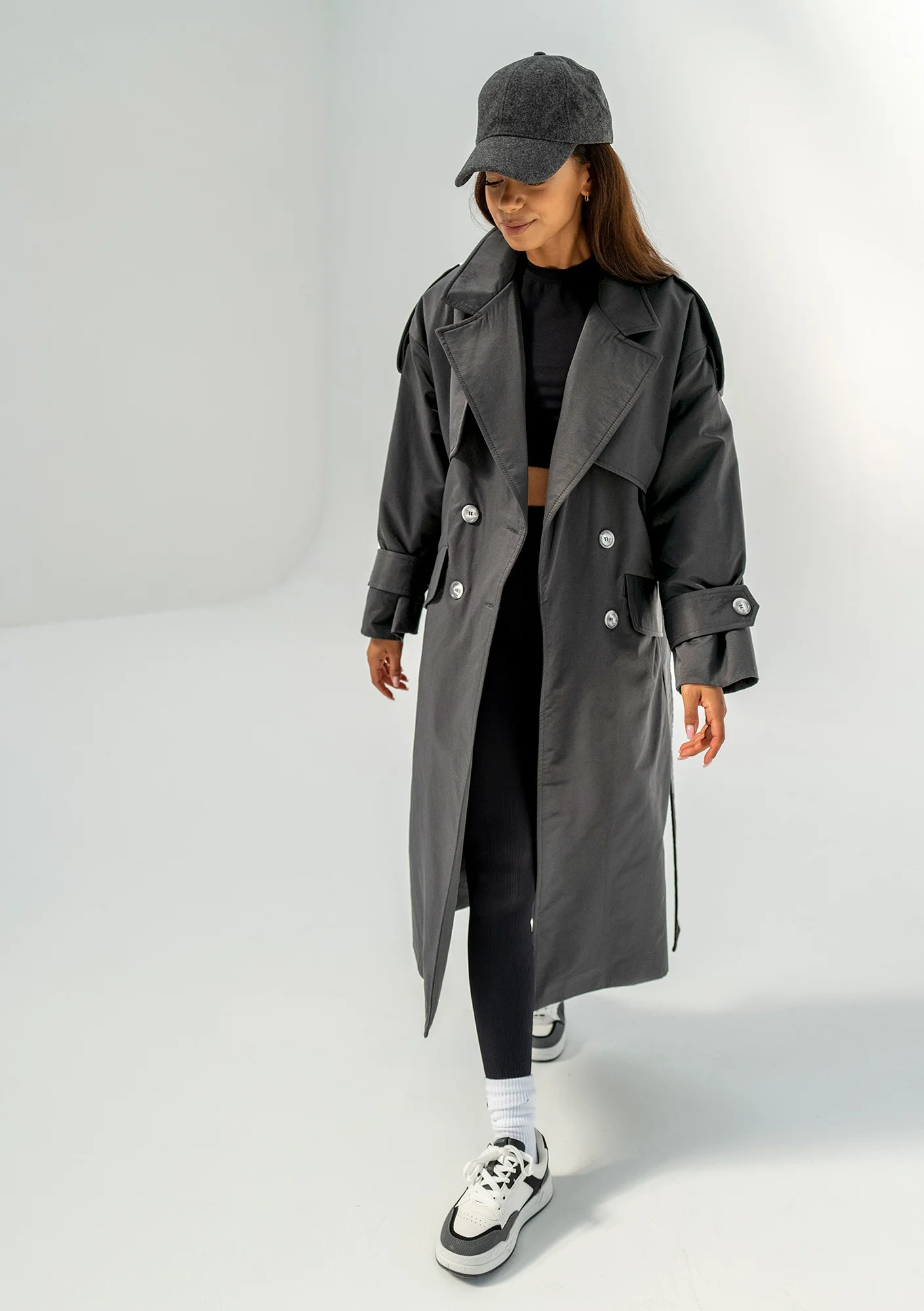 Grafitowy trencz damski idealnie sprawdzi się w okresie przejściowym. Lekki i praktyczny, stanowi eleganckie dopełnienie codziennego ubioru. Do sukienki, spodni, a nawet sportowych stylizacji dresowych: wpisze się w każdą kombinację. Płaszcz dwurzędowy zdobią liczne detale kroju. Na stylowy efekt pracują podpinane mankiety i designerskie klapy przy dekolcie. Dopełnia go pasek oraz praktyczne kieszenie.