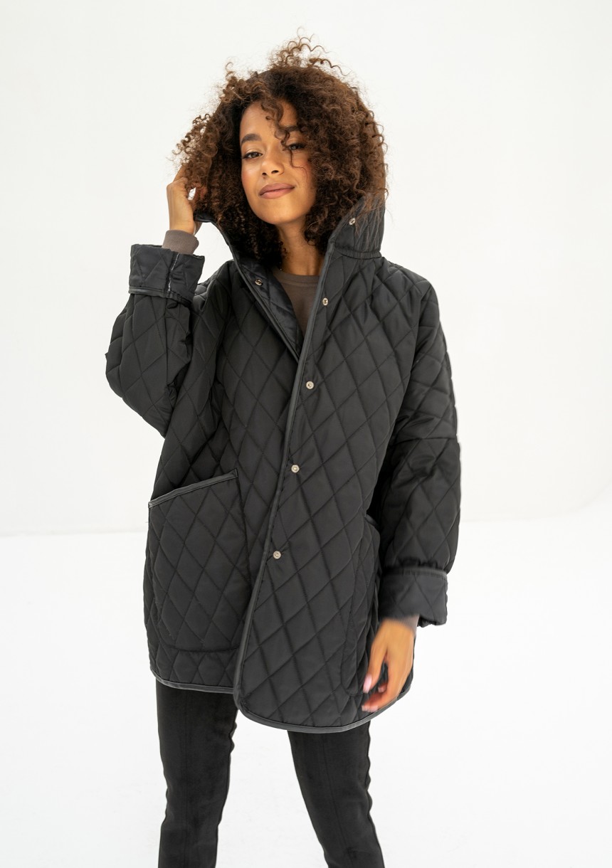 Czarna kurtka damska o pikowanej fakturze, wykonana w zgodzie z aktualnym trendem na fasony oversize. Model z funkcjonalnym kapturem, kieszeniami, zapinany metalowymi napami.