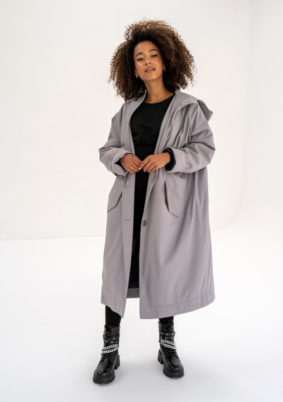 Długi płaszcz damski przeciwdeszczowy, wykonany w modnej formie oversize z kapturem. Model w uniwersalnym, szarym kolorze.