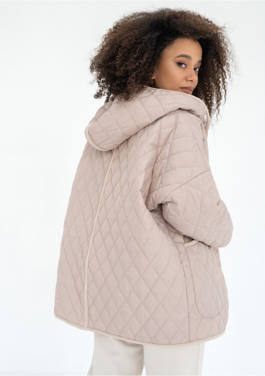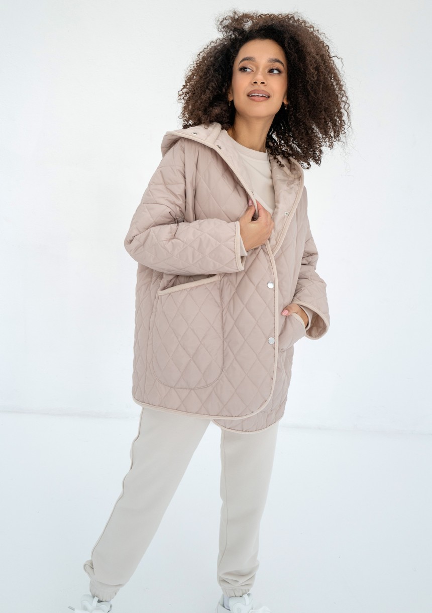 Beżowa kurtka damska o pikowanej fakturze, wykonana w zgodzie z aktualnym trendem na fasony oversize. Model zapinany na napy, z kapturem i kieszeniami.