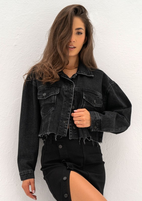 Kurtka jeansowa o krótkim kroju, zapinana metalowymi guzikami, z denimu w czarnym kolorze. Stylowo dopełni dowolnie skomponowany look.
