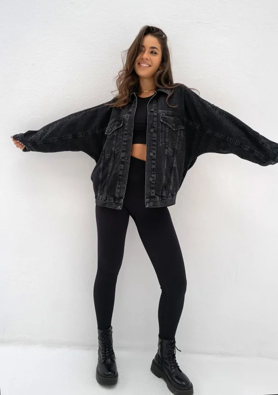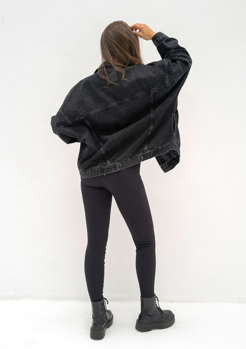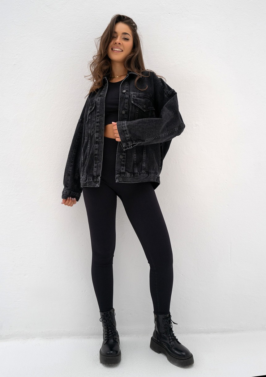Czarna kurtka jeansowa o koszulowym kroju, odrobinę oversize. Zapinana na guziki, dopełniona kieszeniami. Wykonana z tradycyjnego denimu.