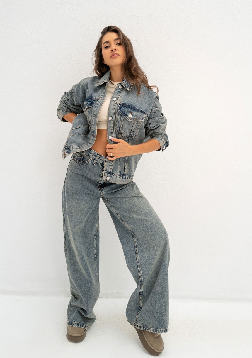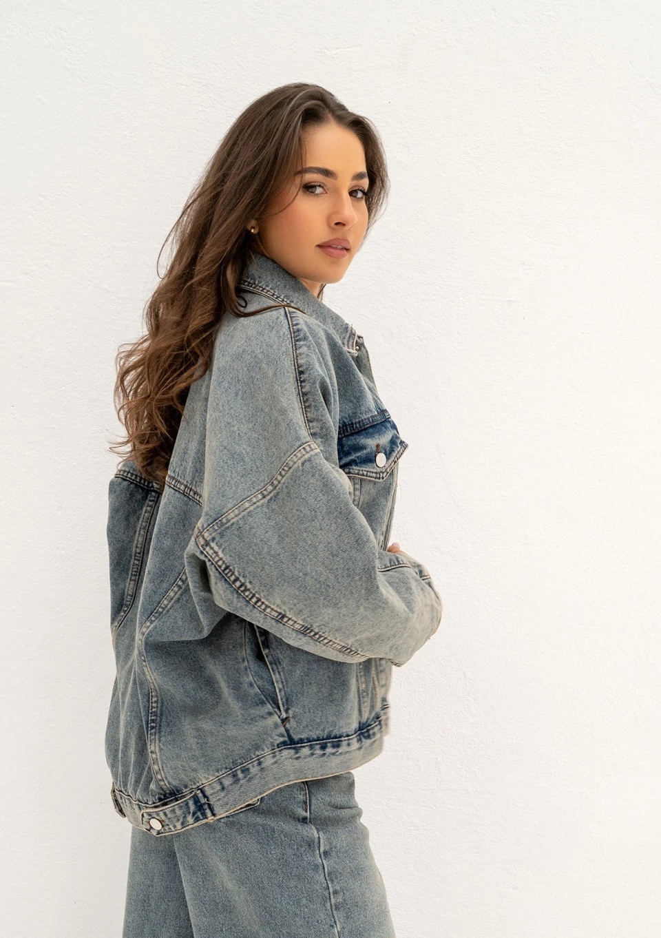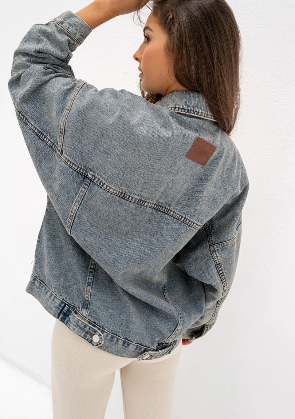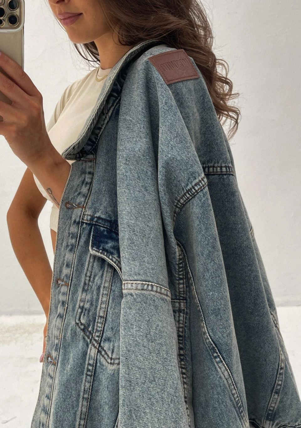 Kurtka jeansowa o koszulowym kroju, odrobinę oversize. Zapinana na guziki, dopełniona kieszeniami. Wykonana z tradycyjnego denimu w wypłowiałym błękicie.