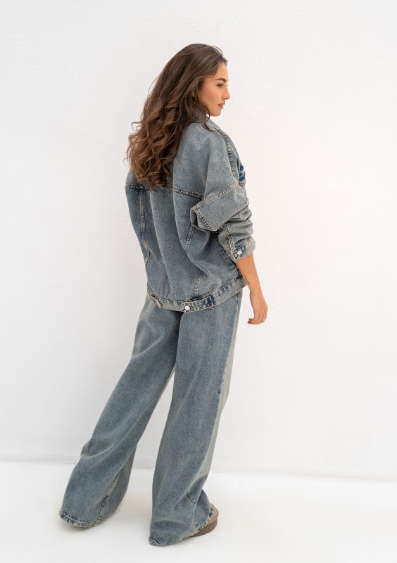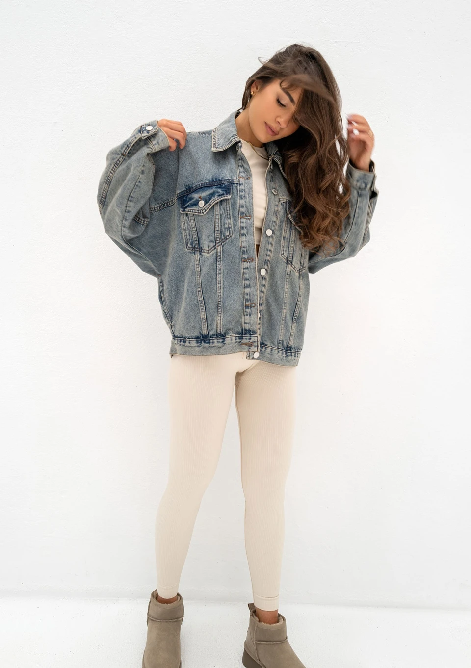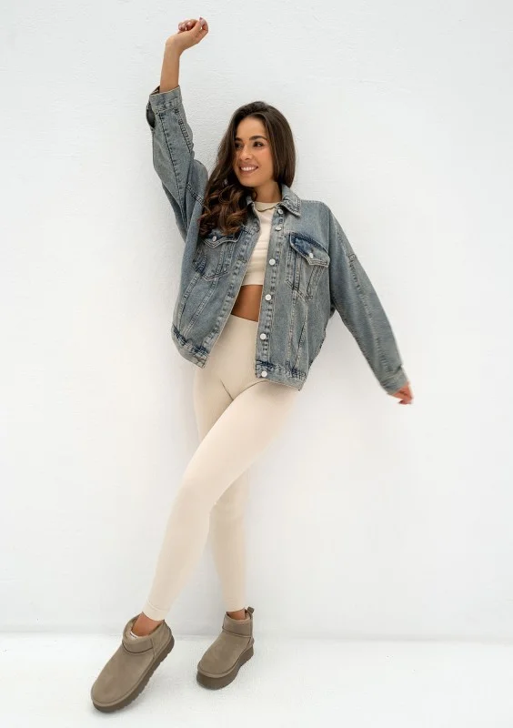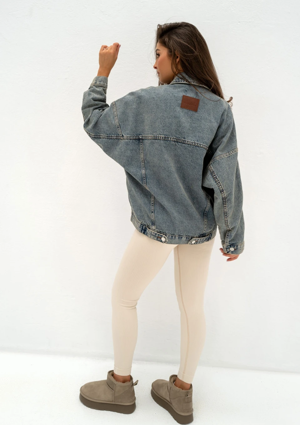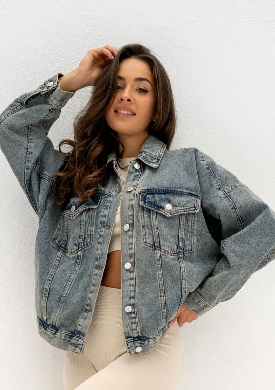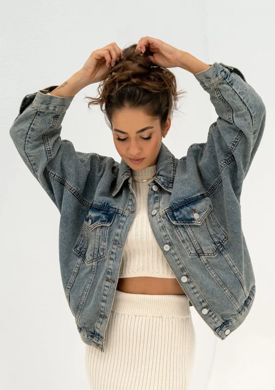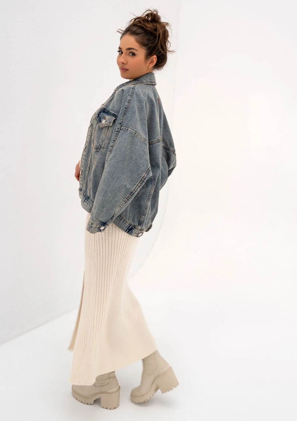 Kurtka jeansowa o koszulowym kroju, odrobinę oversize. Zapinana na guziki, dopełniona kieszeniami. Wykonana z tradycyjnego denimu w wypłowiałym błękicie.