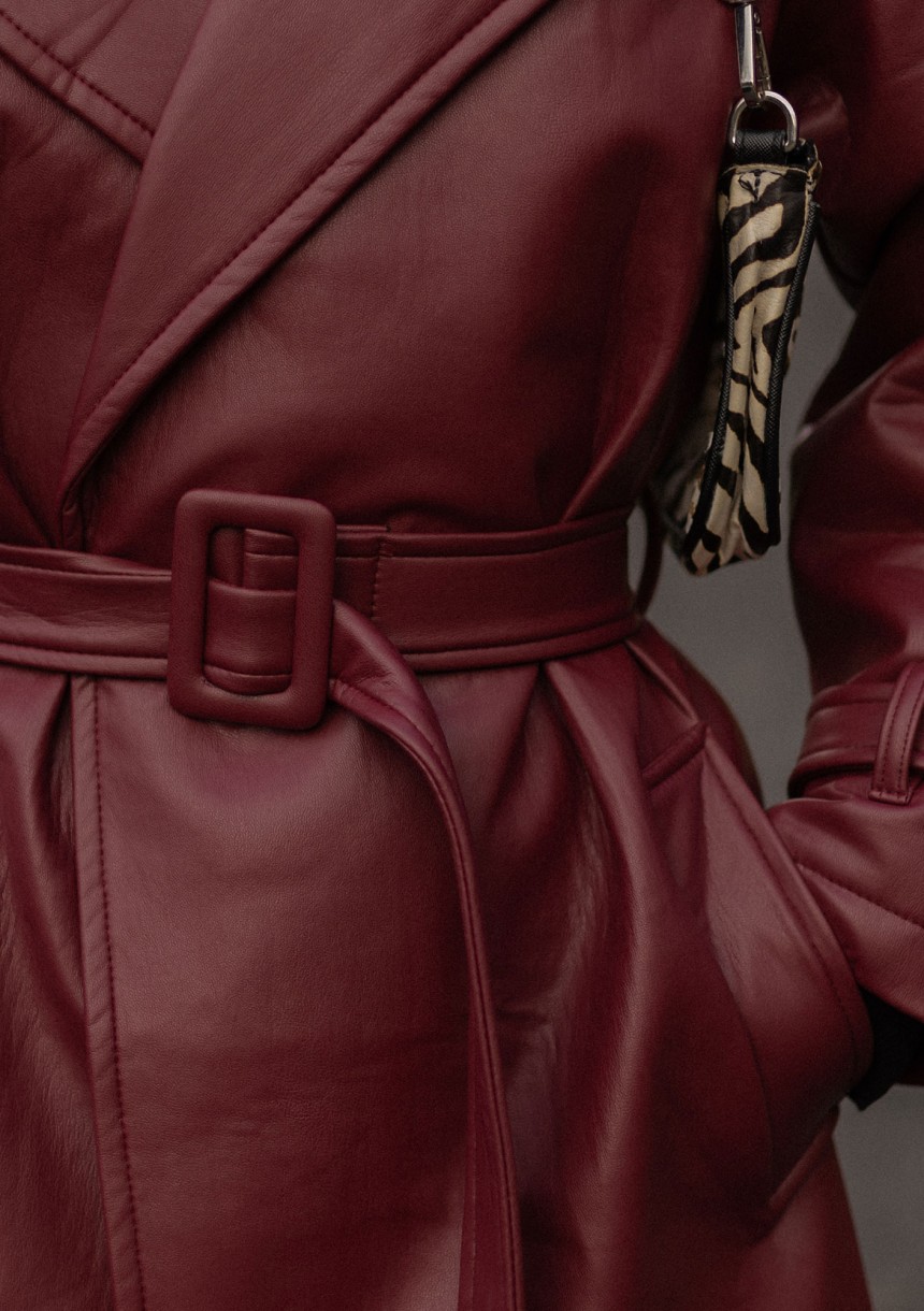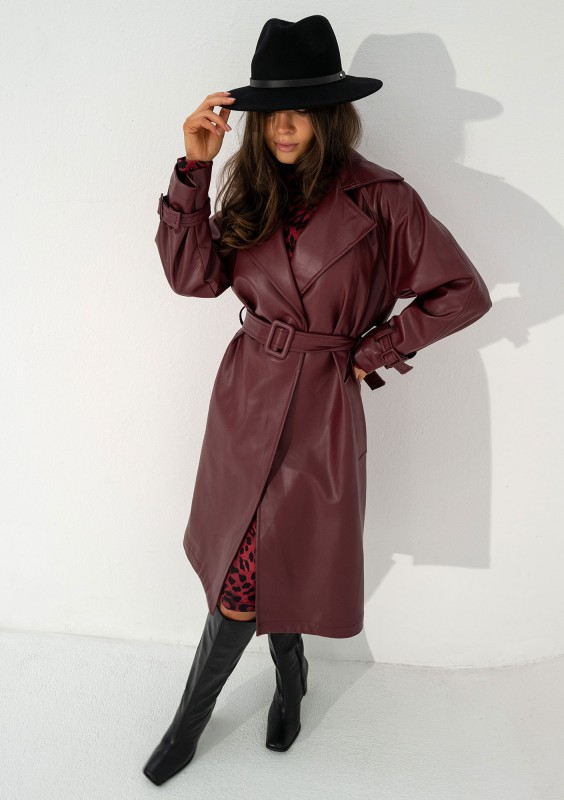 Stylowy płaszcz damski z paskiem, eleganckim kołnierzem i modną klapą, na porę przejściową. Wykonany w bordowym kolorze z imitacji skóry.