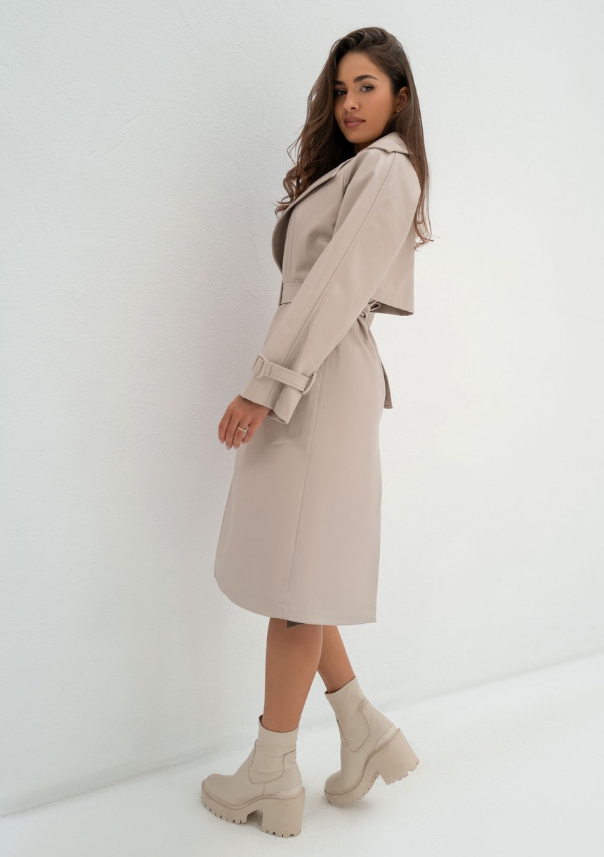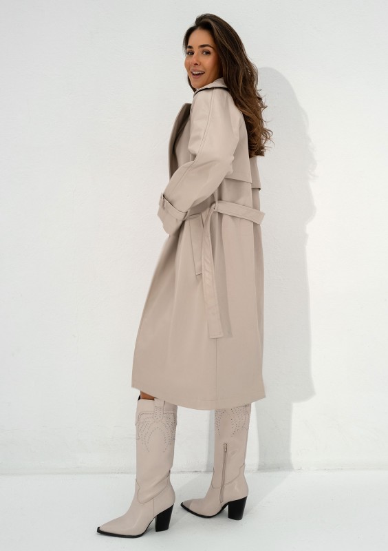 Gładka imitacja skóry prezentuje się niezwykle elegancko, szczególnie w delikatnym, beżowym kolorze. Ten jesienny płaszcz damski doskonale dopełni szykowne kombinacje na specjalne okazje czy na co dzień, do biura. Model pięknie dopełni każdą sukienkę, czy damski garnitur. Design jest wyjątkowo modny dzięki tylnej klapie.