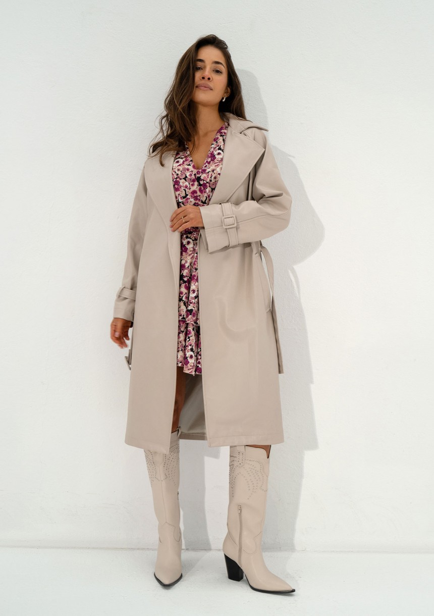 Stylowy płaszcz damski z paskiem, eleganckim kołnierzem i modną klapą, na porę przejściową. Wykonany w beżowym kolorze z imitacji skóry.