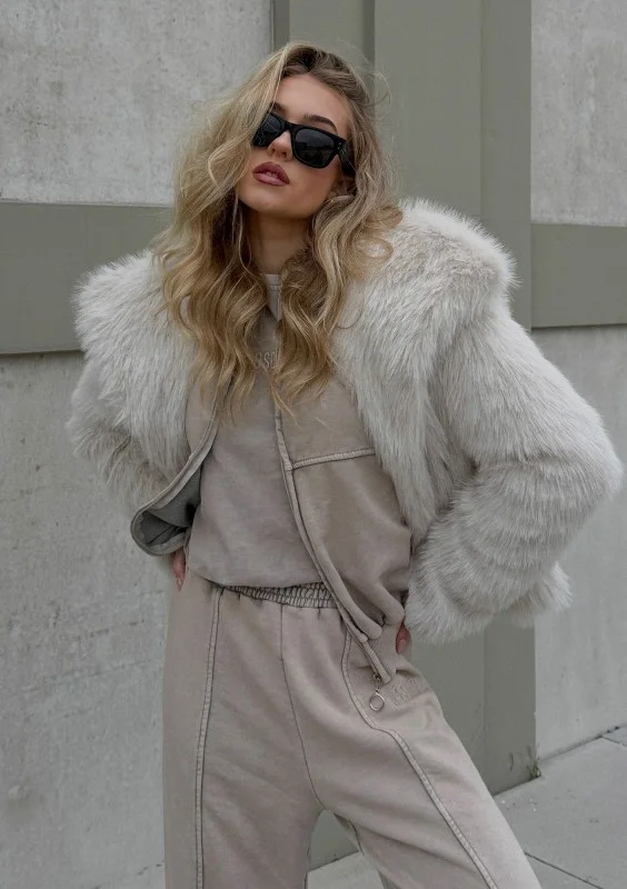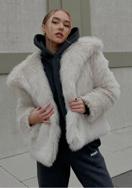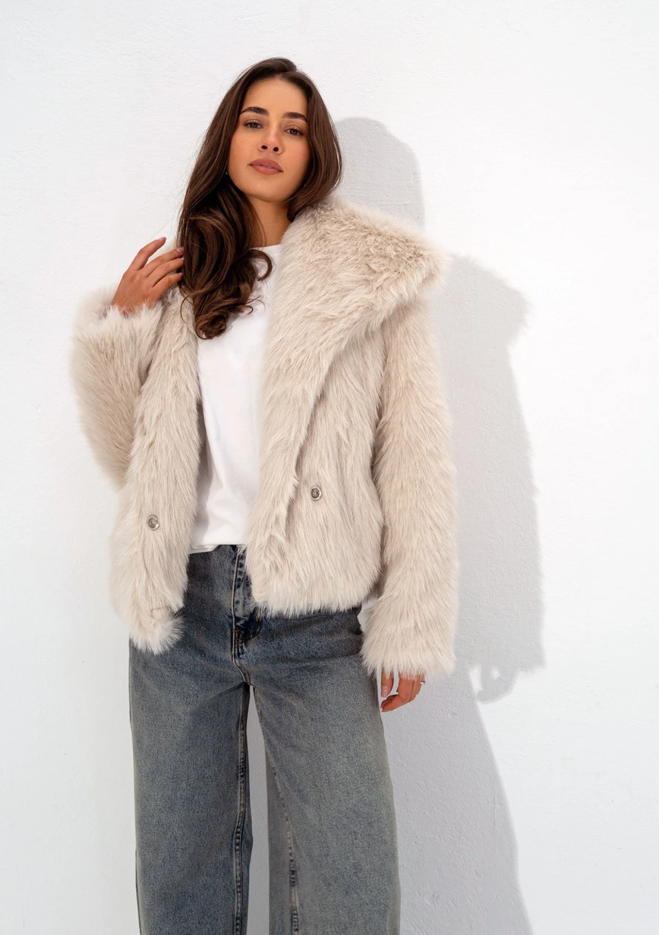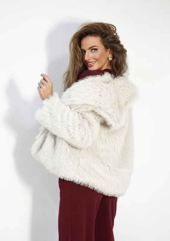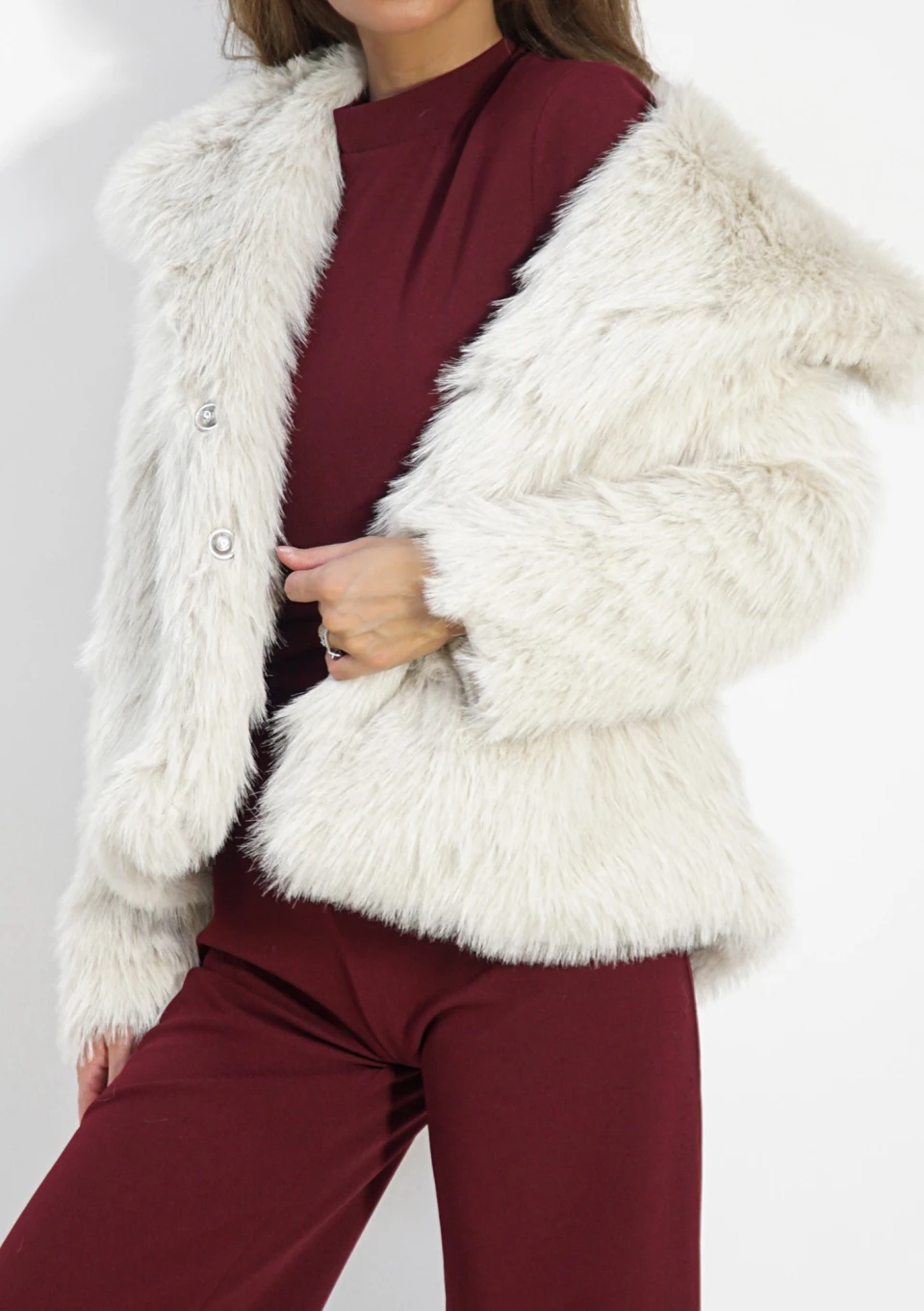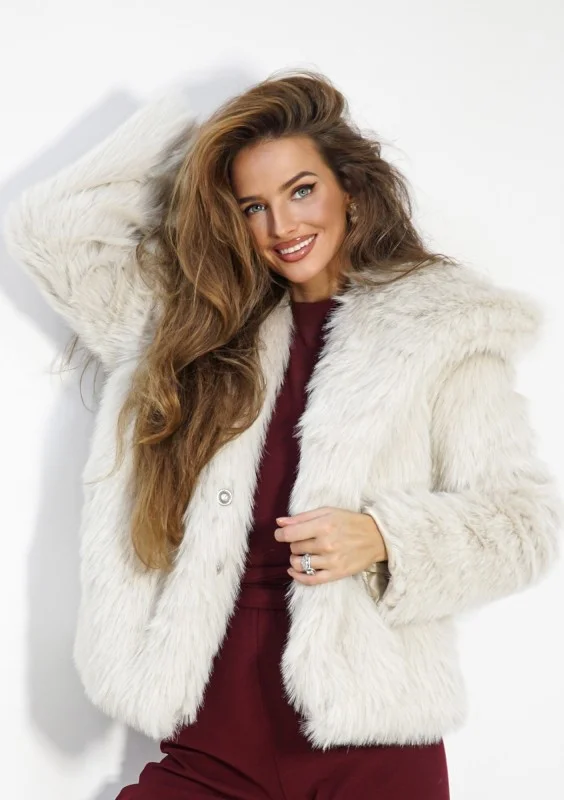 Efektowne futerko w kolorze ecru doda wyjątkowego stylu! Wykonane z imitacji, ciepłe i łatwe w pielęgnacji. Wygodnie zapinane na napy.