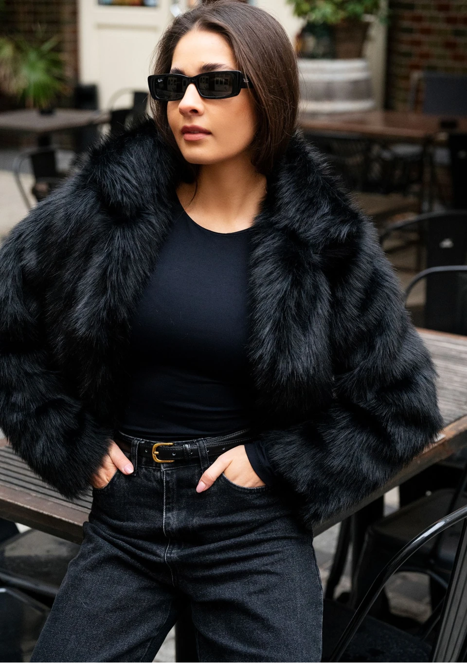 Modne czarne futerko damskie z imitacji w subtelnej, nieprzeskalowanej formie. Idealne na początek! Stylowe i ciepłe, wykończone stójką.