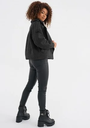 Czarna kurtka damska z bukli. Fakturą przypomina baranie futerko, składa się z wielu supełków, pętelek i puchatych zgrubień. W produkcji używamy bardzo miękkiej i przyjemnie ciepłej odmiany tego materiału. Wybierz ten model dla siebie, jeśli znudziły Ci się tradycyjne fasony i poszukujesz najmodniejszej, unikatowej alternatywy.