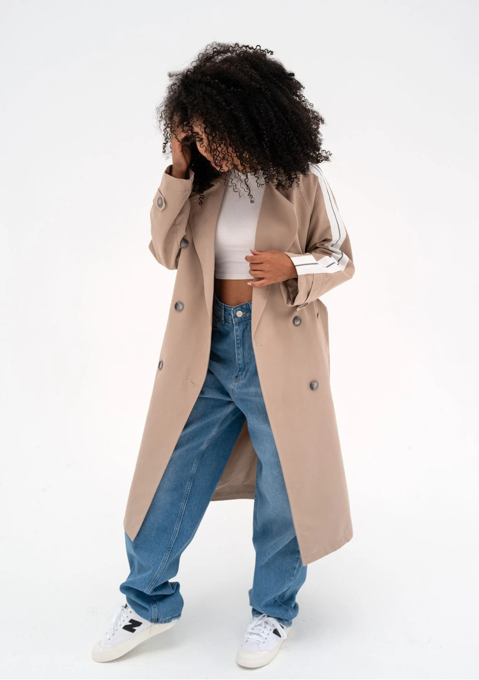 Stylowy trencz damski wiosenny w najświeższej estetyce lampasów. Model w beżowym kolorze, ze świetnego materiału z bawełną. Idealny na wiosnę.