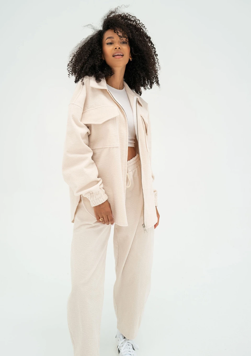 Sztruks znów jest na topie! Ten miły w dotyku, prążkowany materiał, kojarzony głównie z sezonem jesienno-zimowym, w swojej lżejszej, bawełnianej formie idealnie odnajduje się wiosną. Dodaje stylizacjom faktury i vintage'owego uroku, co jest obecnie bardzo pożądane. Postaw na materiał z nowoczesną interpretacją! U nas czekają na Ciebie modne kurtki damskie oversize w trzech uroczych barwach, które zapewnią Ci lekki i promienny wygląd. Do każdej z nich możesz dokupić pasujące odcieniem luźne spodnie od kompletu. Prezentowana kurtka została wykonana w delikatnym odcieniu bieli ecru. Zapewni Ci świeży, wiosenny i pełen lekkości wygląd i ładnie połączy się z innymi kolorami.