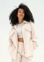 Fason oversize, koszulowy, zapinany na zamek, z kieszeniami.