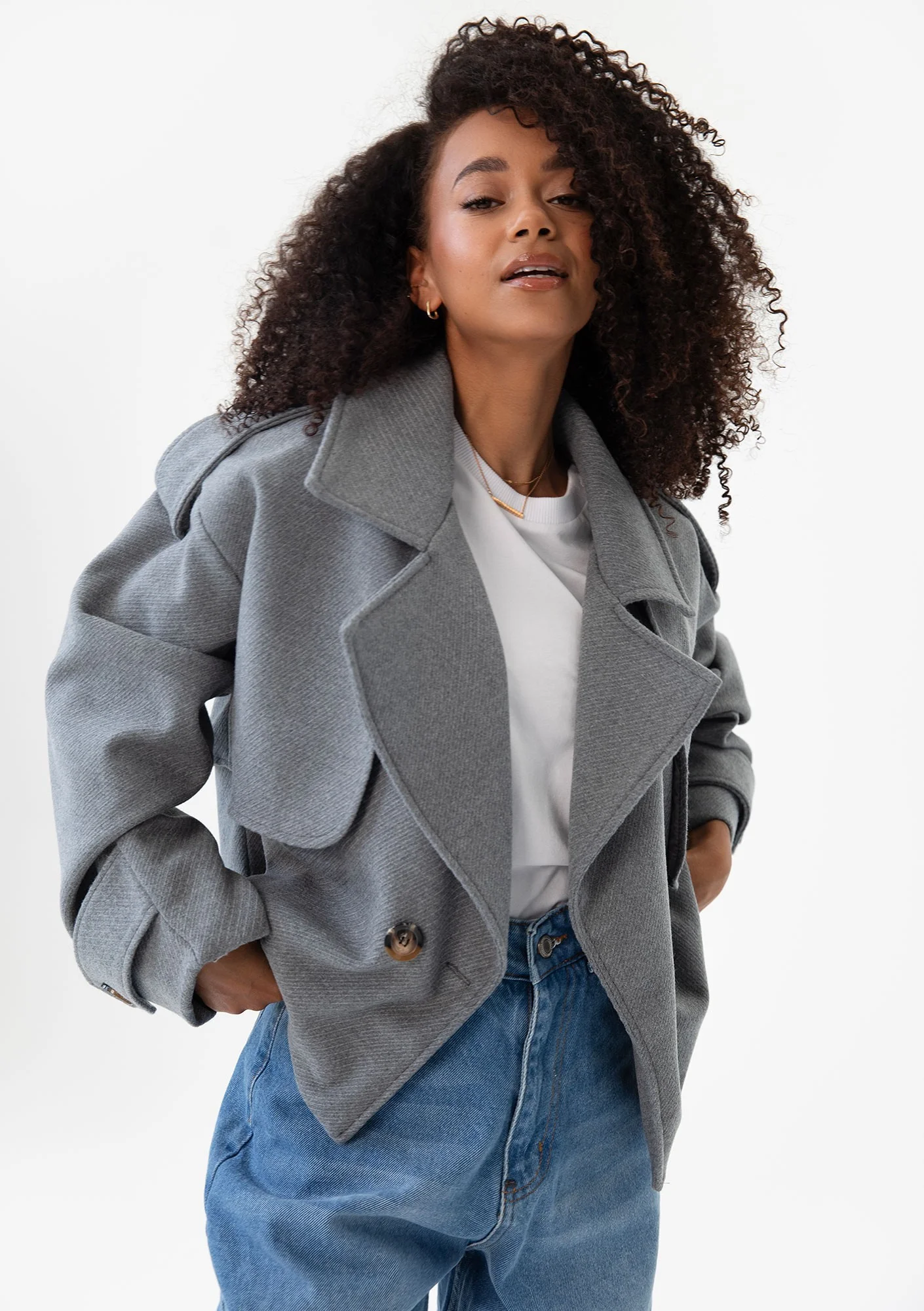 Zacznij jesień z nową energią. Aby stworzyć look, który przyciąga uwagę, nie potrzebujesz krzykliwych kolorów, wystarczy, że postawisz na elegancki basic w oryginalnym wydaniu. Krótka kurtka dwurzędowa Lumo to fason z pazurem, który wyróżnia luźna, nonszalancka forma oversize. Eleganckiego designu dopełniają klapy, pagony oraz ponadczasowe guziki w kolorze szylkretu. Ta unikatowa, polska kurtka damska jest dostępna tylko w Mosquito, w trzech szykownych kolorach. Szary, w jakim jest prezentowana, pasuje absolutnie do wszystkiego!