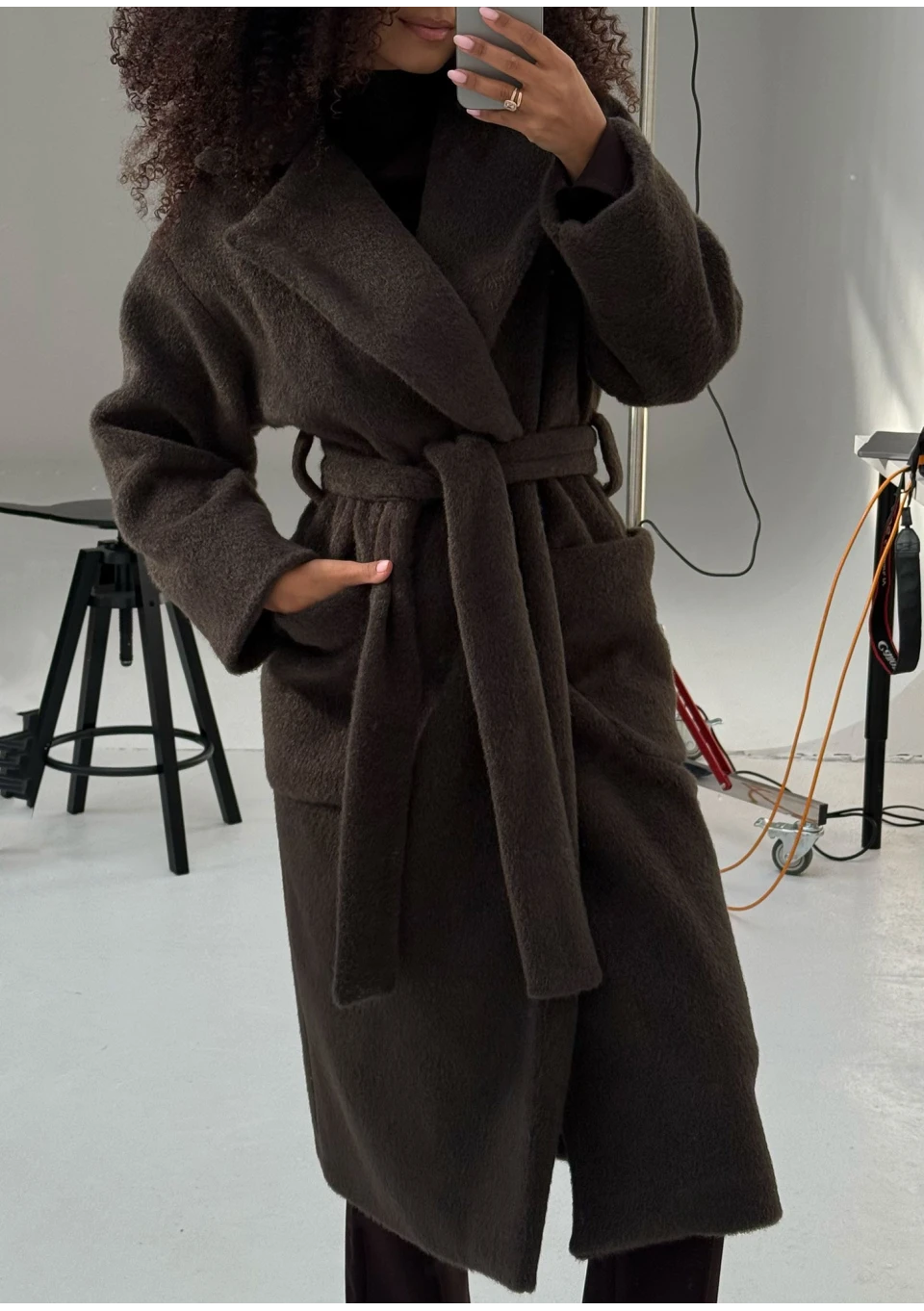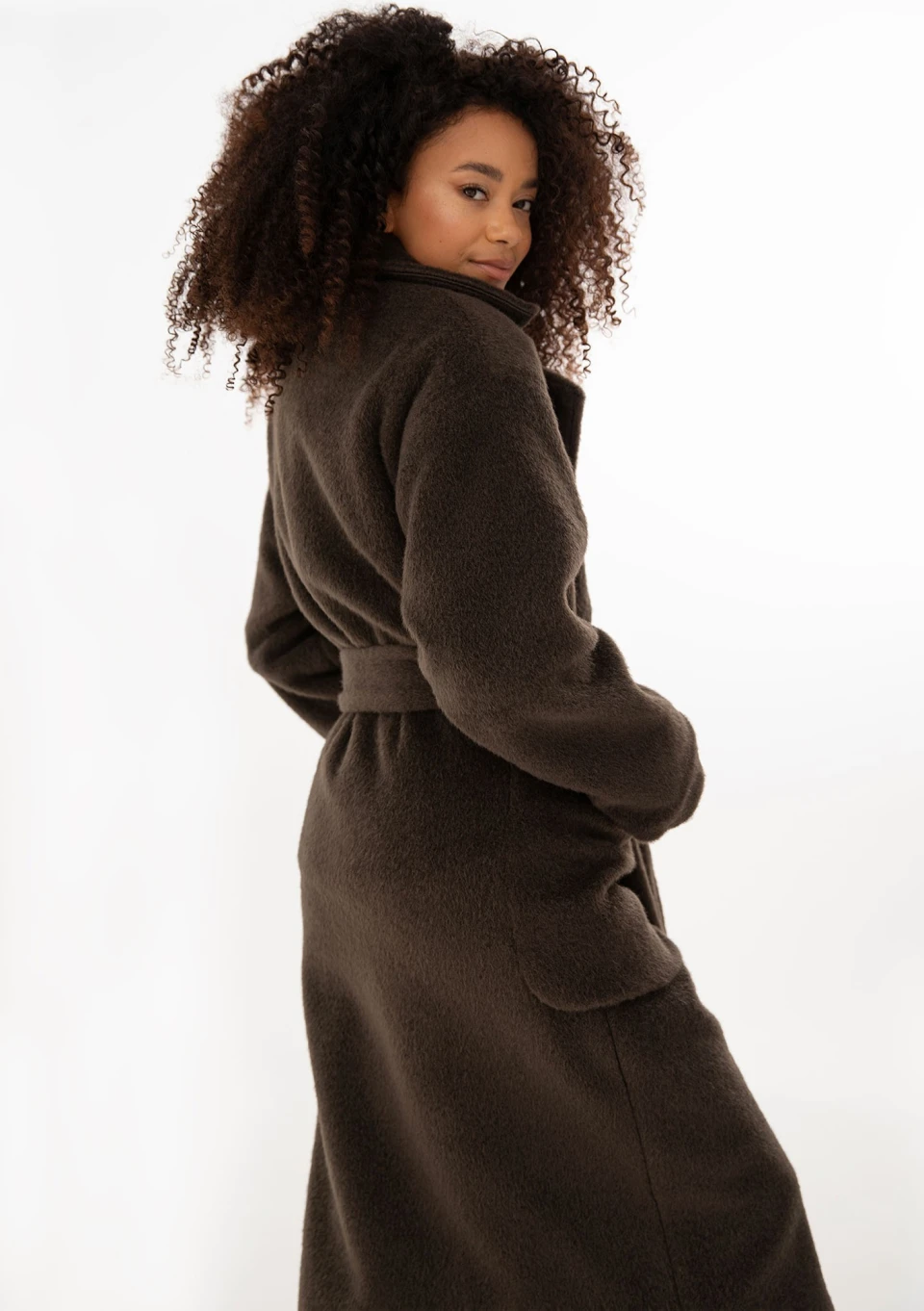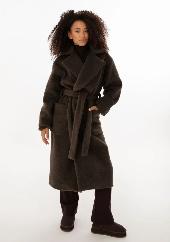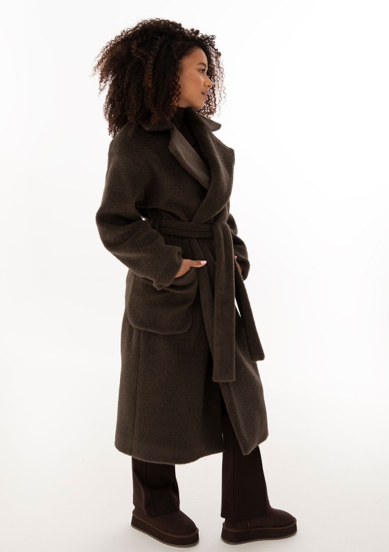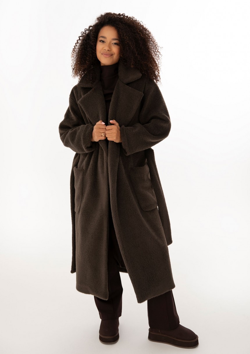 Ciepły i przytulny płaszcz z paskiem i rozłożystym kołnierzem, udoskonalony pojemnymi kieszeniami. Model w czekoladowym kolorze.
