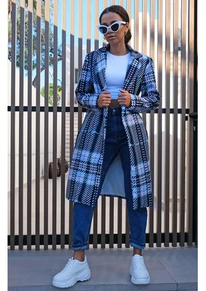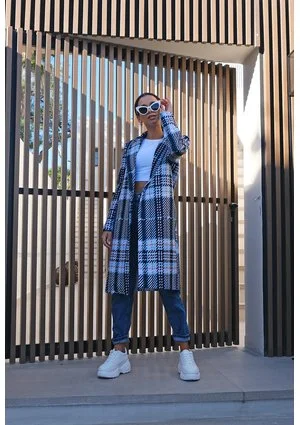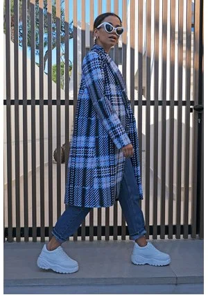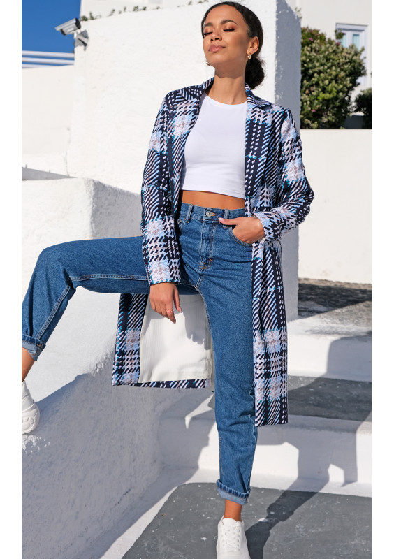 Płaszcz z flauszu drukowany w Kratę błękitny