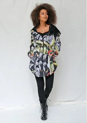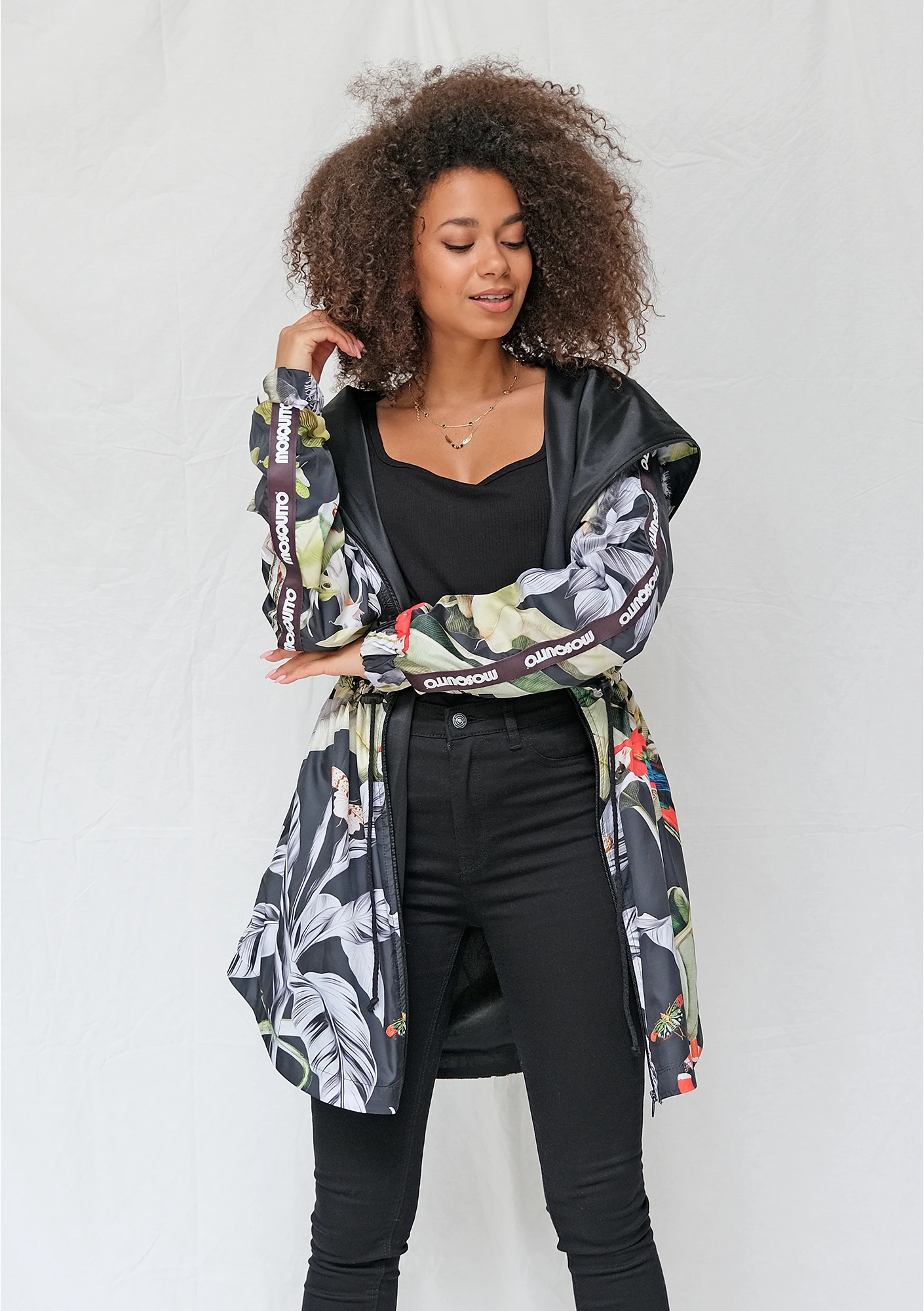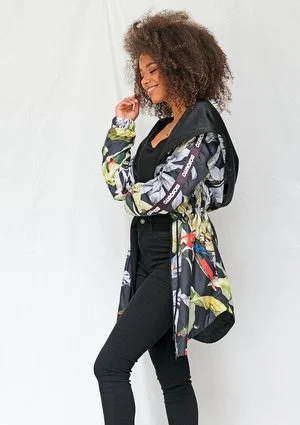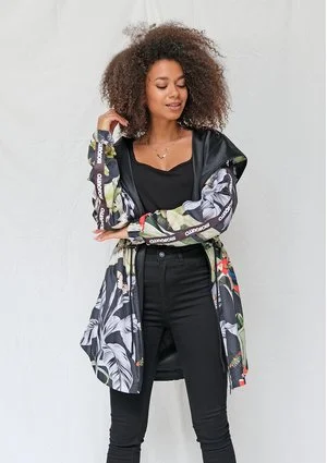 Materiał nie przepuszcza wody. Jednocześnie pozwala na swobodny przepływ powietrza pomiędzy skórą i otoczeniem, zmniejszając pocenie się. Modna damska kurtka przeciwdeszczowa ma jeszcze jeden ważny atut - jest nim unikatowy print w stylu egzotycznym. Utrzymana w ciemnych kolorach parka wyróżnia się na tle innych ubrań, a kolorowy nadruk stylowo wkomponowuje się w ulubione kreacje. Dodatkowy lampas na rękawach dodaje odzieży charakteru. Kurtkę nosić można zarówno do odzieży sportowej, jak i strojów ubieranych na co dzień. Odzież sprawdzi się w warunkach górskich i miejskich, starannie chroniąc swoją użytkowniczkę przed opadami. Przeciwdeszczowa kurtka z kapturem szyta jest w Polsce. Model posiada kieszenie. Brak polarowego podszycia, dlatego kurtka nie przesiąka wilgocią, lecz zapobiega przedostawaniu się jej pod materiał.