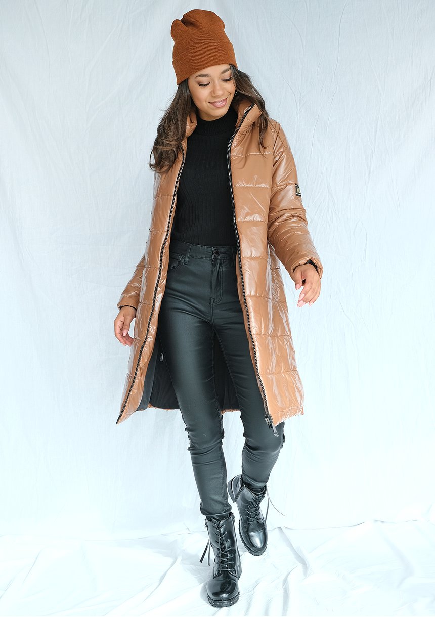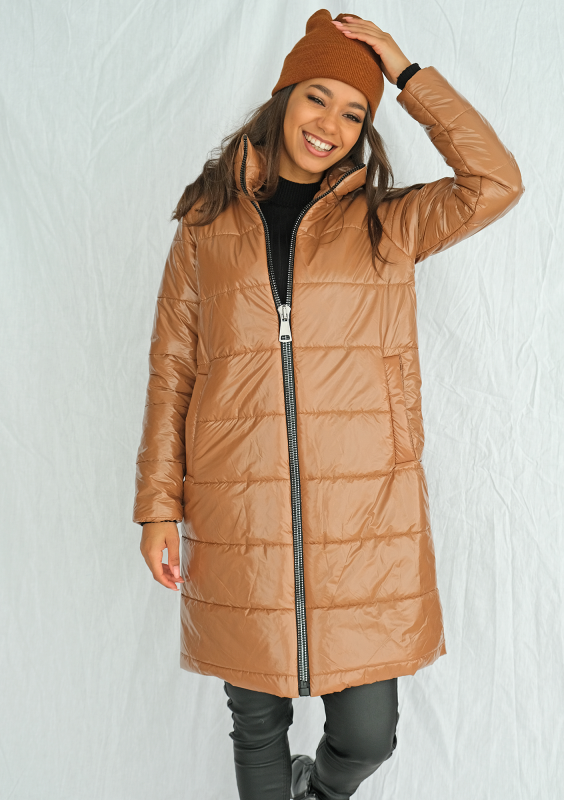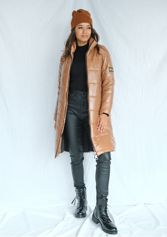 Pikowany płaszcz na stójce karmelowy