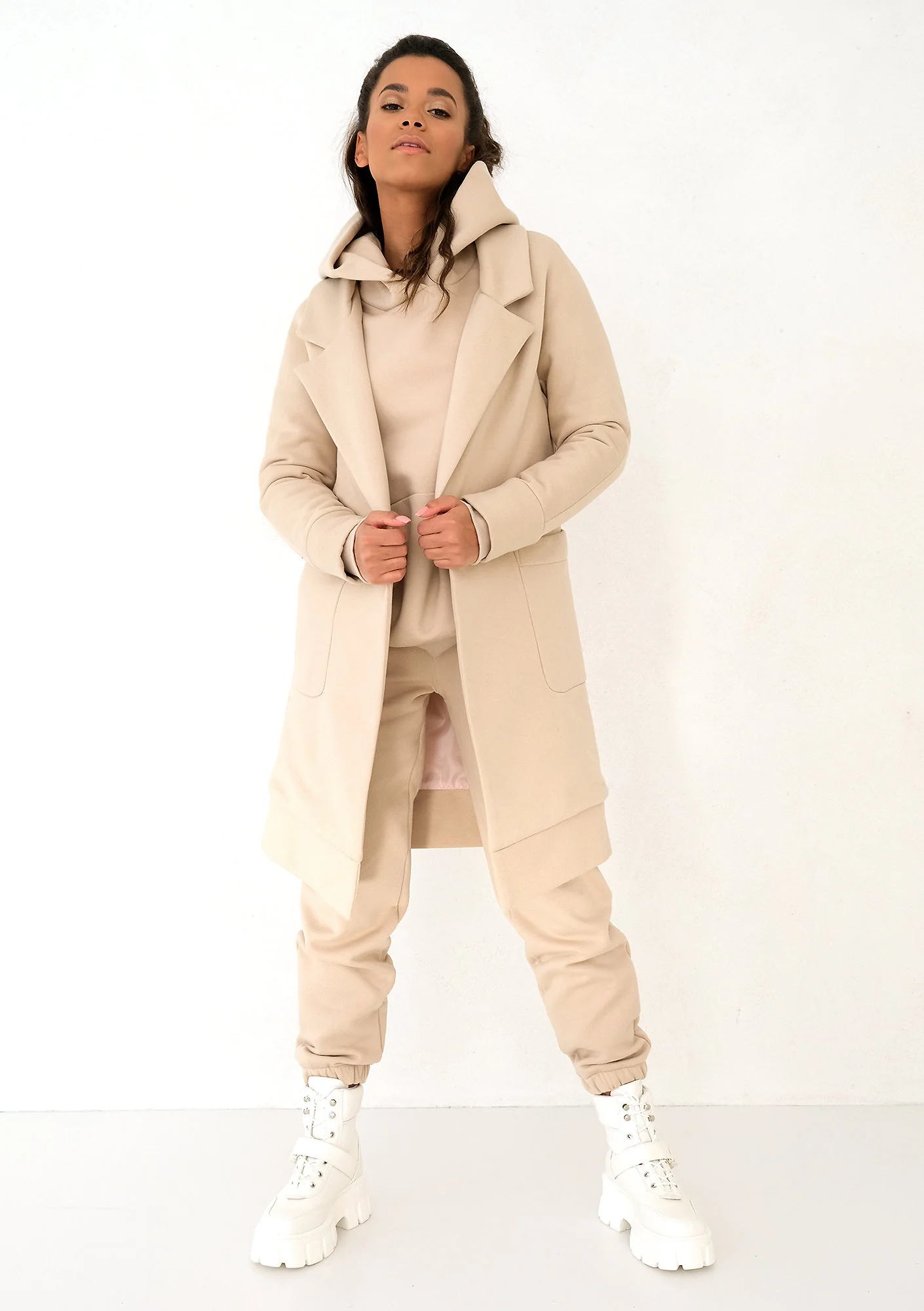 Beżowy płaszcz w piaskowym odcieniu to bardzo sportowy model. Poliester, z którego jest wykonany, odparowuje wilgoć znacznie szybciej, niż bawełna dlatego nie będziesz niemiło zaskoczona w sytuacji niespodziewanego, przelotnego deszczu wiosennego. Płaszcz posiada ochronną, śliską podszewkę. Dzięki niej, materiał nie będzie tarł ubrań pod spodem, co zniweluje ryzyko ich zmechacenia i elektryzowania. Wygodne, duże kieszenie po bokach posłużą Ci jako schowek na drobiazgi i zmarznięte dłonie. Płaszcz posiada zapięcie w postaci guzika oraz estetyczny, klasyczny krój kołnierza. Prezentowany, długi płaszcz beżowy nie posiada kaptura – na widocznych zdjęciach modelka ma pod spodem bluzę z kapturem z tej samej linii kolorystycznej Warm Sand. Dostępne rozmiary produktu to XS – L.