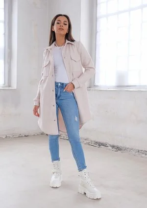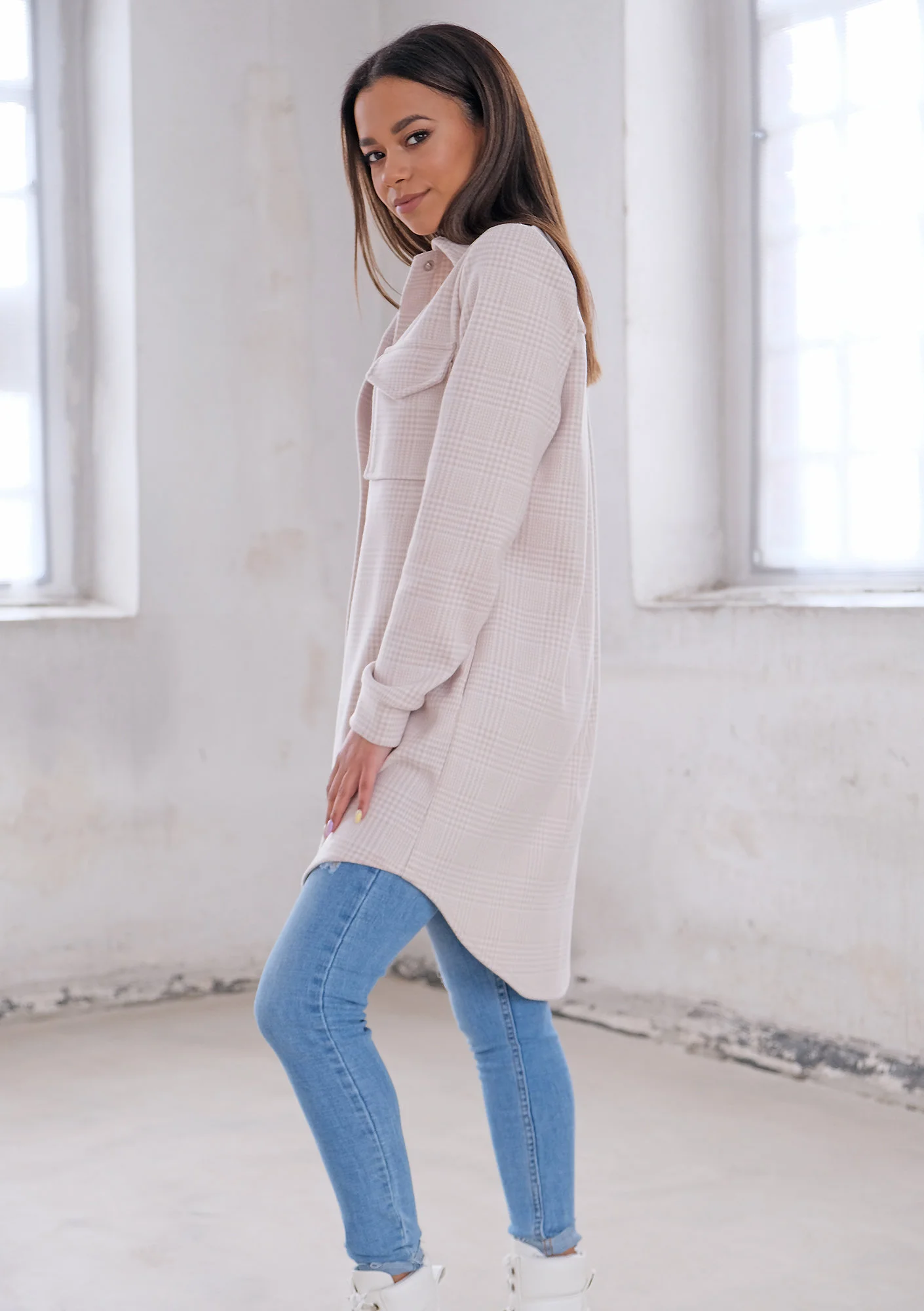 Niesztampowa i oryginalna koszula o długości midi odmieni Twoje dotychczasowe stylizacje i nie pozwoli na modową nudę! Wygodna, bo nieco luźna, będzie Ci się ją świetnie nosiło wiosną i w chłodniejsze dni letnie. Fason zastąpi trencze, narzutki i kardigany. Prezentowany model ma śliczny deseń beżowej kratki. Długą koszulę damską możesz zakładać ją do zwykłych koszulek, spodni i legginsów. Koszula jest zapinana na metalowe klipsy. Fason ubrania mocno nawiązuje do tradycyjnej, damskiej koszuli: posiada gustowne kieszonki i kołnierz, a o funkcji lekkiego płaszcza przypomina nie tylko długość, ale i zszycie połów na łopatkach.