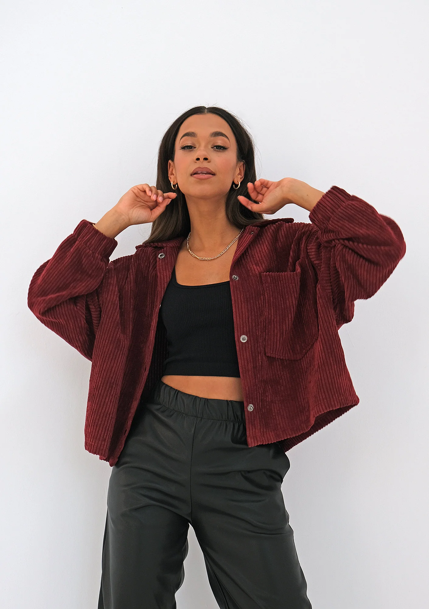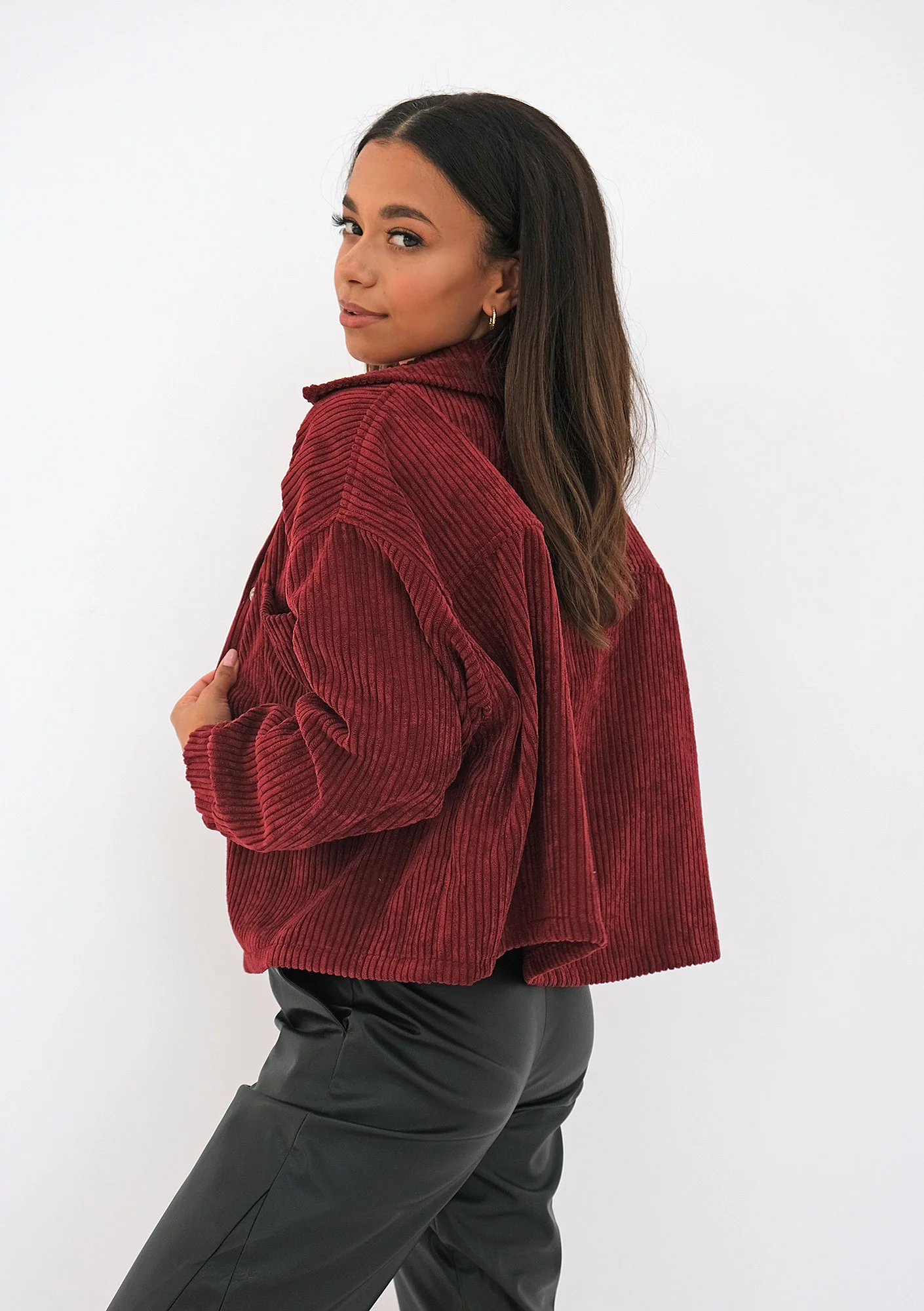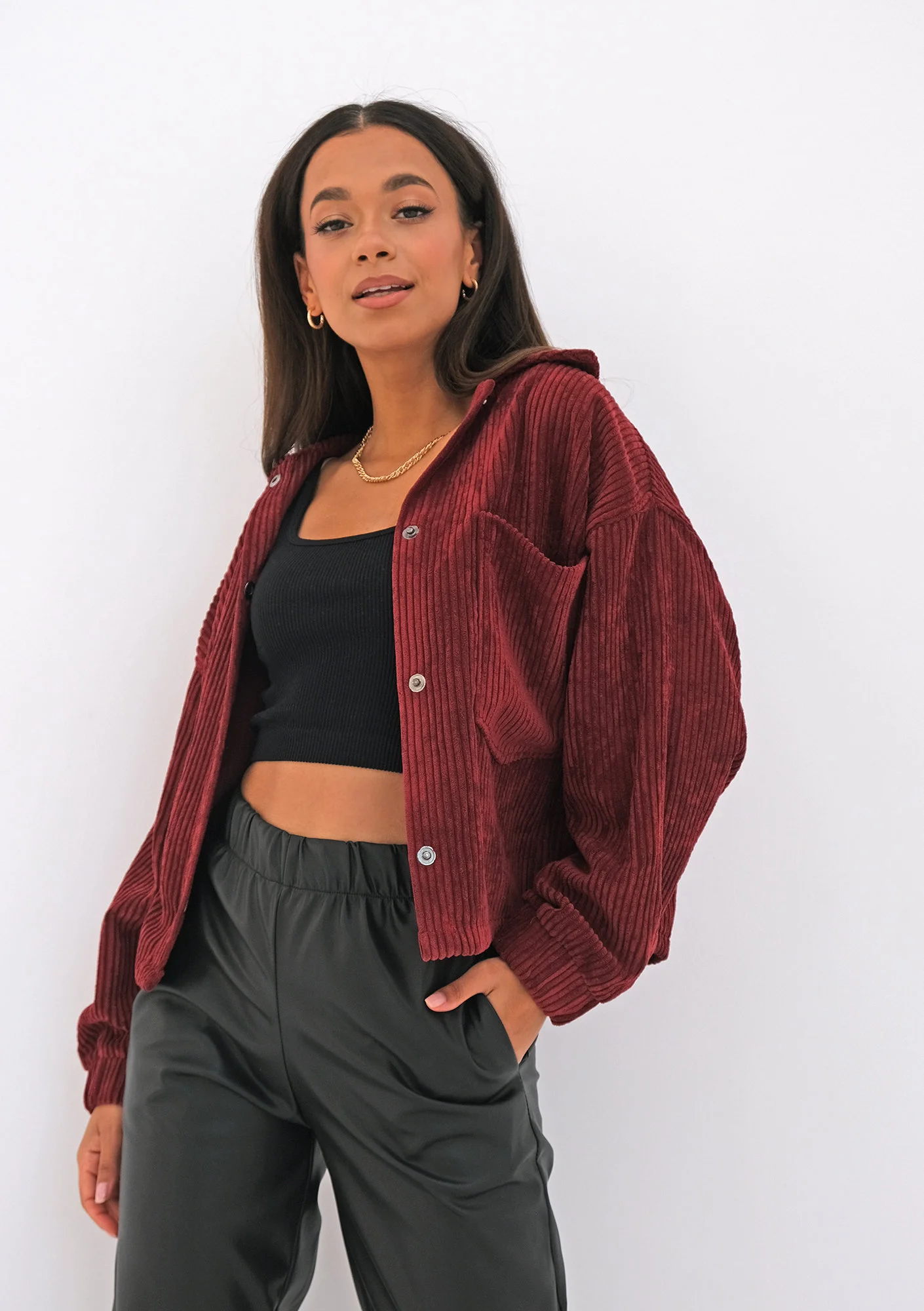 Bordowe koszule ze sztruksu warto łączyć ze spodniami o równie ciekawych fakturach: skórzanymi lub zamszowymi, lecz również całkowicie wystarczą najzwyklejsze dżinsy. Jeśli spodobała Ci się stylizacja naszej modelki Jackie, ma ona na sobie czarne spodnie joggery z eko skóry, które również znajdziesz w naszej aktualnej kolekcji. Ubrania szyjemy w rozmiarach XS, S, M i L – wybierz ten, który zazwyczaj nosisz na co dzień, z pewnością od razu dobrze trafisz! Sztruksowa koszula występuje również kolorze czarnym i musztardowym. Na naszym profilu na Instagramie powoli zaczynają się pojawiać jesienne stylizacje – koniecznie oznacz nas na swoim własnym, kreatywnym zestawie i pomóż innym kobietom poszukującym inspiracji :)