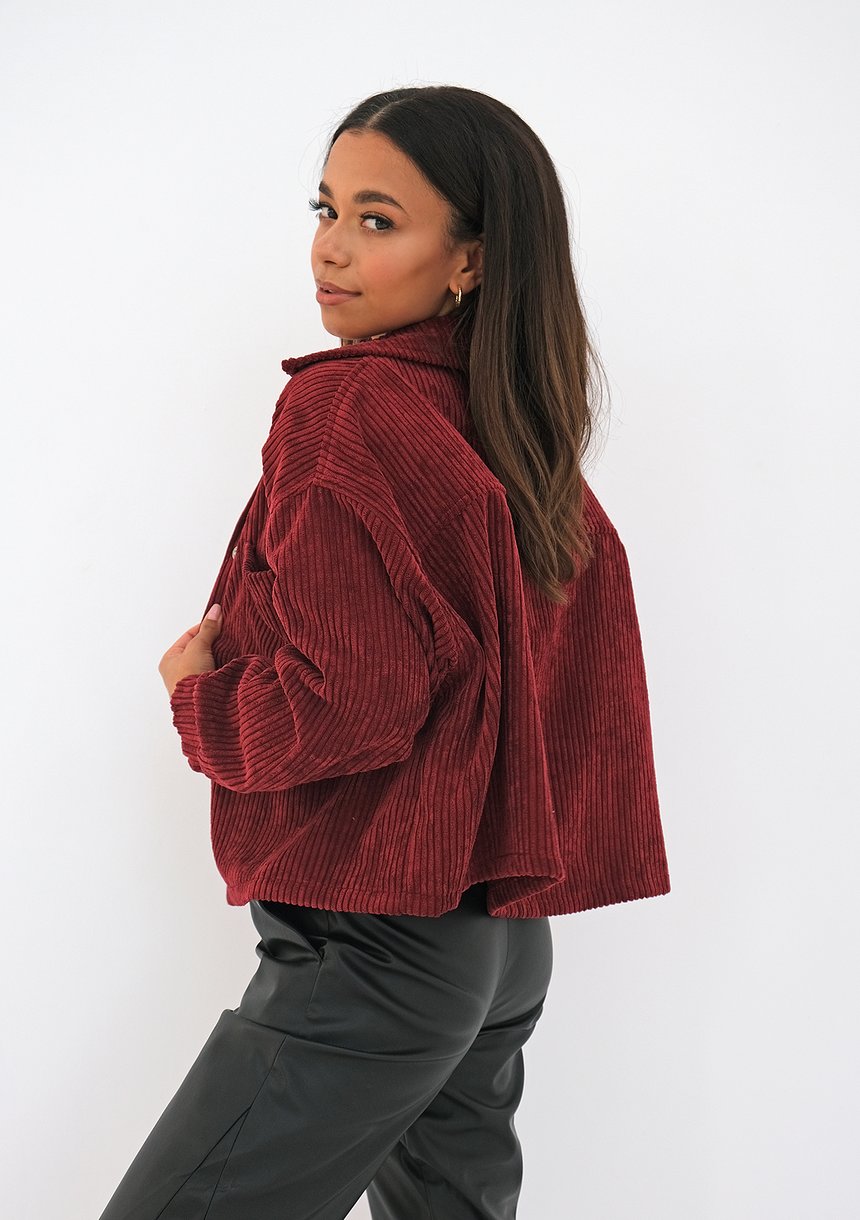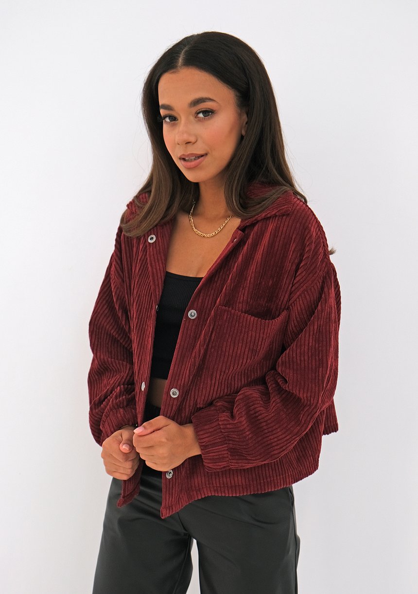 Bordowa, krótka koszula o fasonie oversize, wykonana z najmodniejszego obecnie sztruksu. Koszulowy fason zawdzięcza metalowym napom, kieszonce i kołnierzykowi. Wygodne, bardzo stylowe okrycie w lekko rockowym stylu.