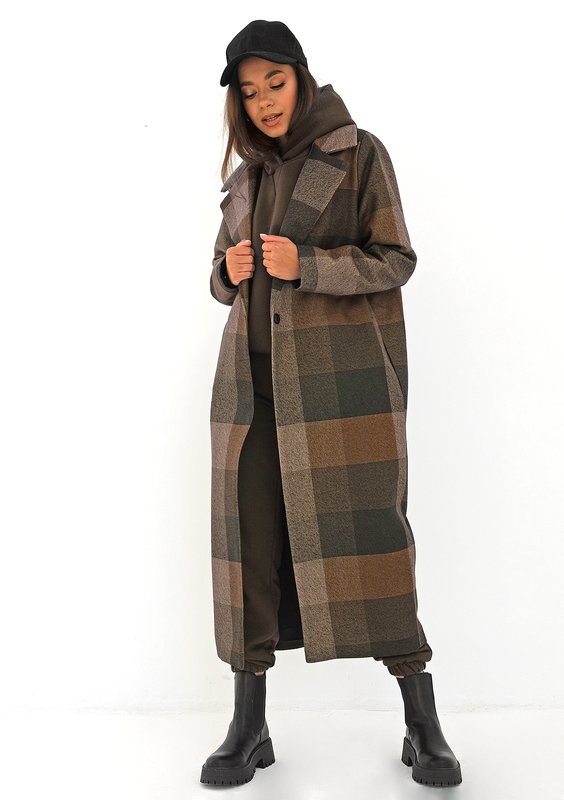 Ciepły płaszcz w brązową kratę, o klasycznym, wiązanym paskiem kroju midi. Posiada kieszenie i elegancki kołnierz. To stylowy model podszyty śliskim materiałem.