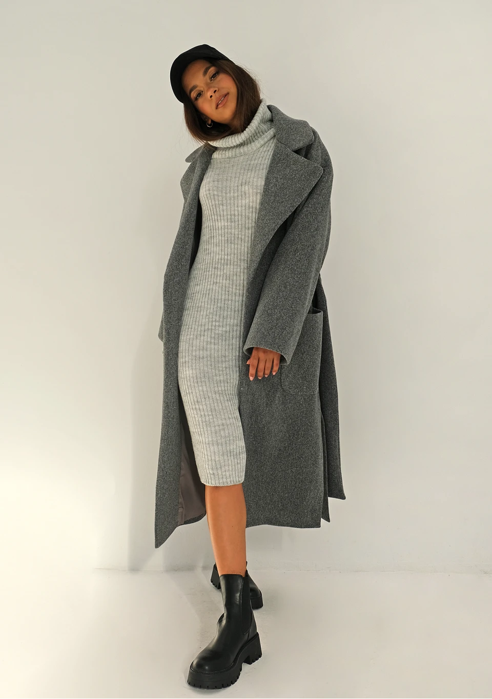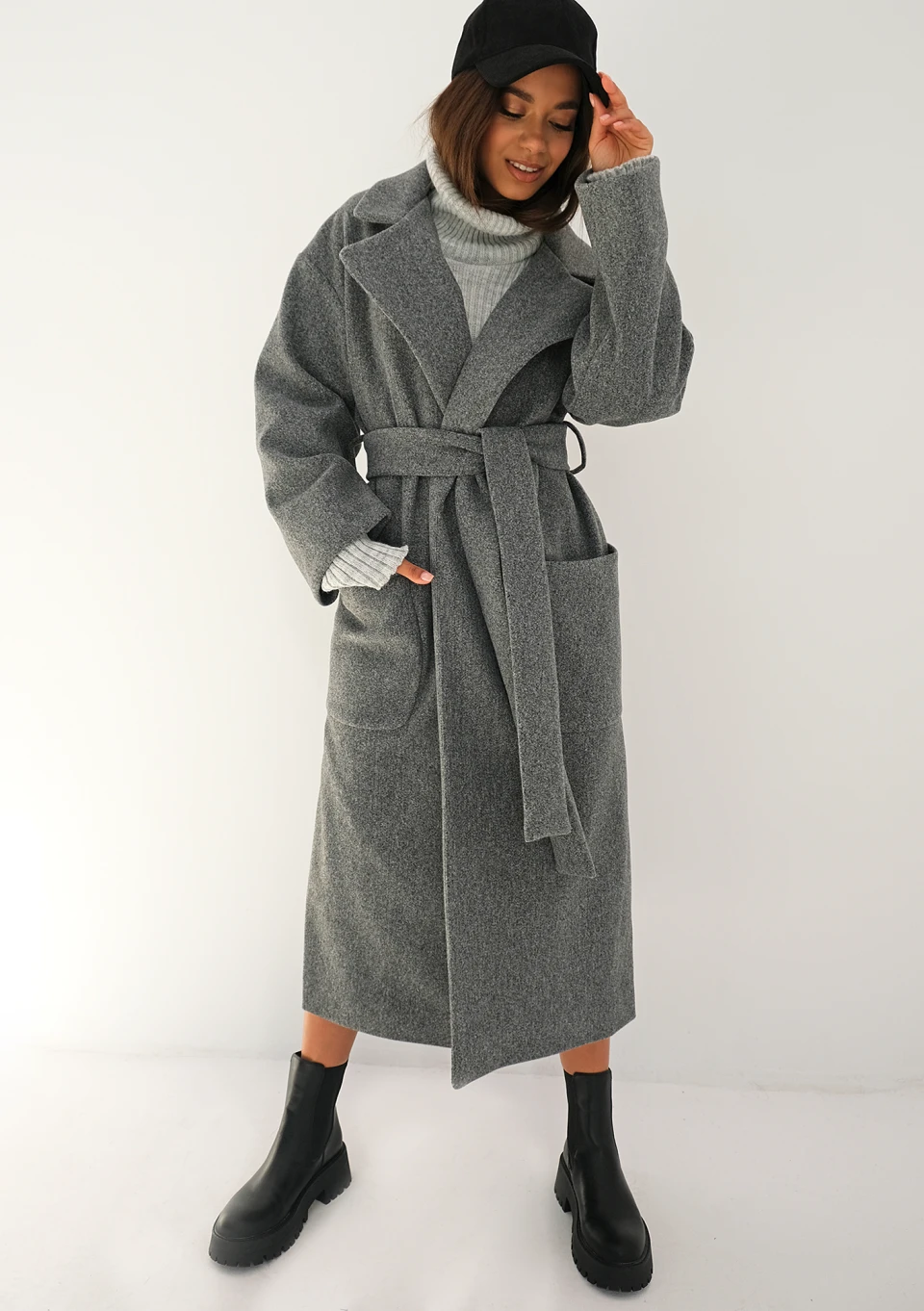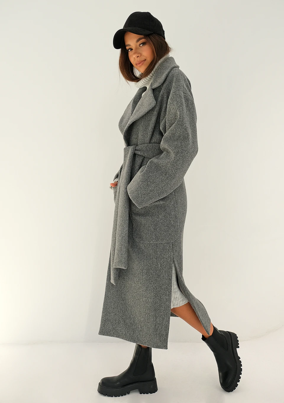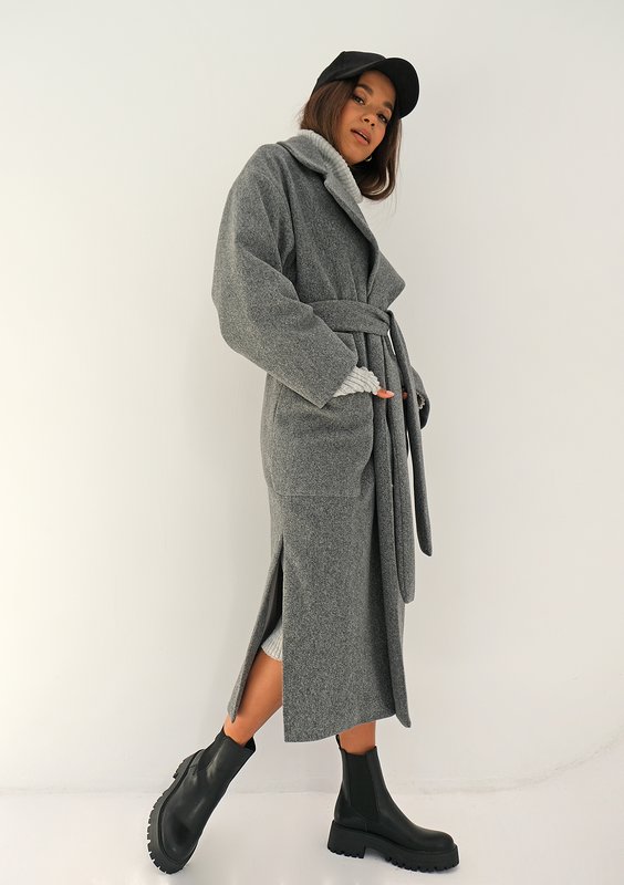 Klasyczny, szary płaszcz damski z paskiem, wykonany z ciepłej, flauszowej dzianiny. Model z dużymi kieszeniami, bocznymi rozcięciami, efektownym kołnierzem i śliską podszewką.
