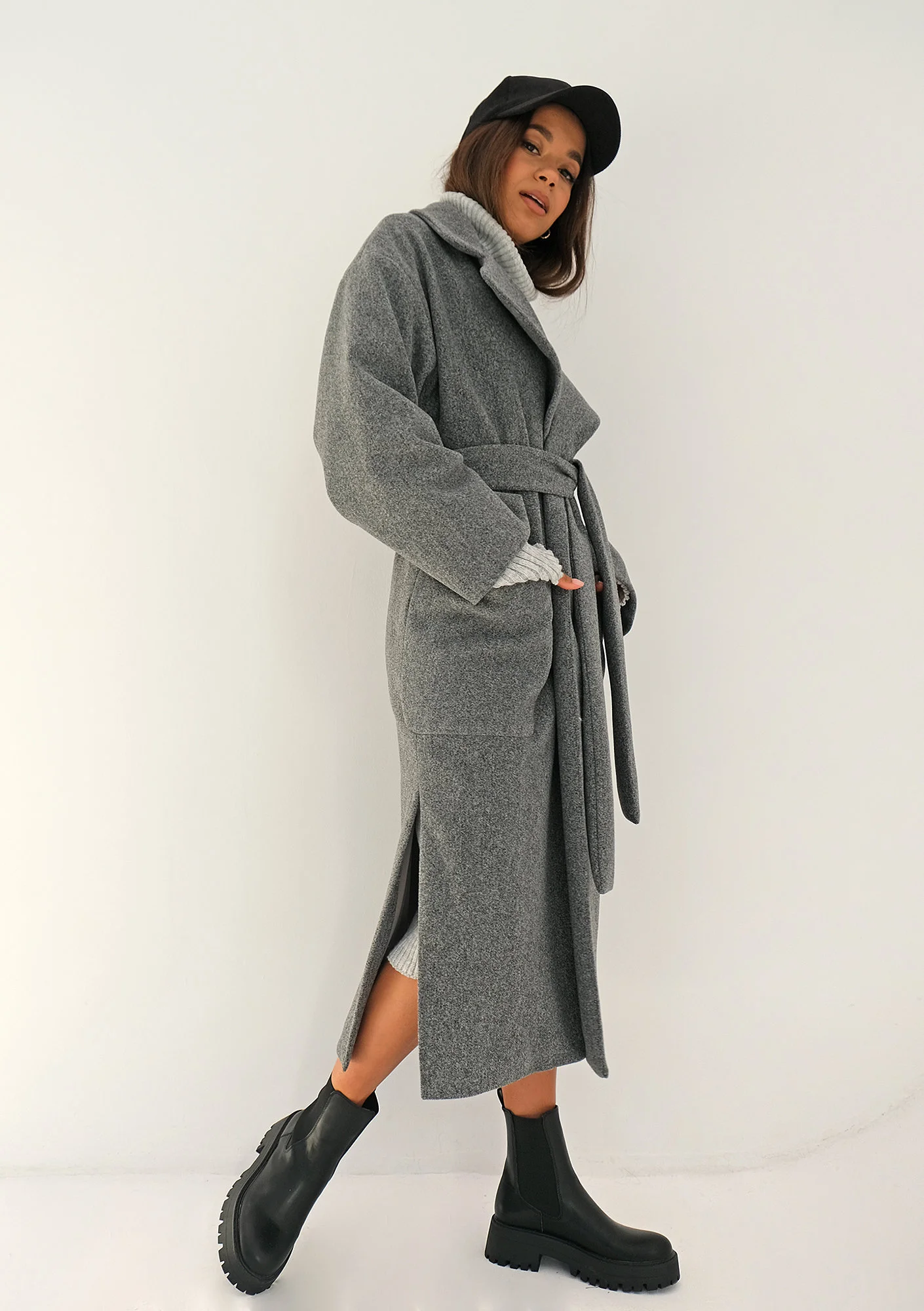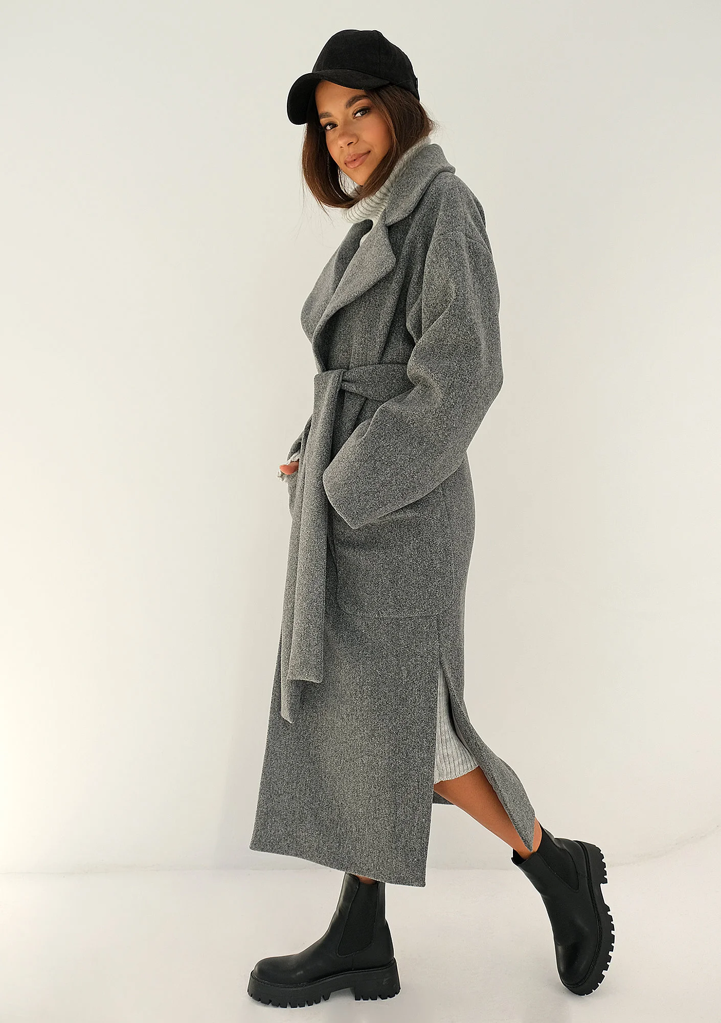 Fason midi, luźny, wiązany paskiem, z kołnierzem, rozcięty po bokach.