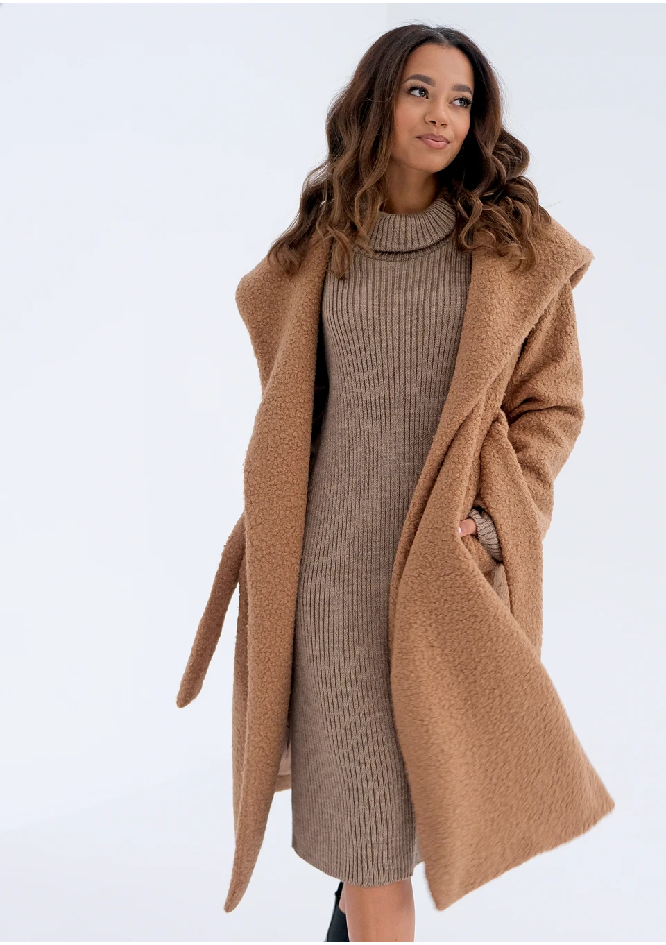 Klasyka gatunku, czyli ciepły, zimowy płaszcz w eleganckim odcieniu camelowym. Wykonany z przyjemnie miękkiej, futerkowej dzianiny, która stanowi mocny i trwały trend. Posiada kieszenie i pasek, od spodu podszyty ochronnym, śliskim materiałem.