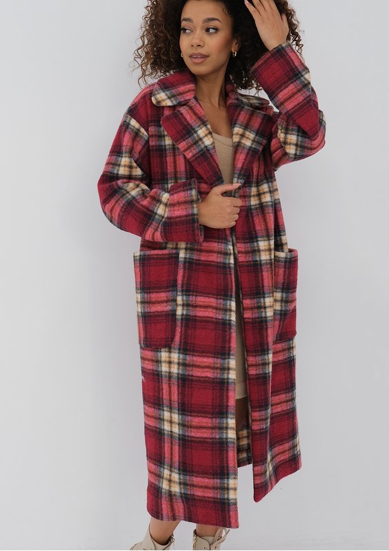 Czerwony płaszcz damski w najmodniejszą kratę, z paskiem i wygodnie dużymi kieszeniami. Uszyty z ciepłego flauszu.