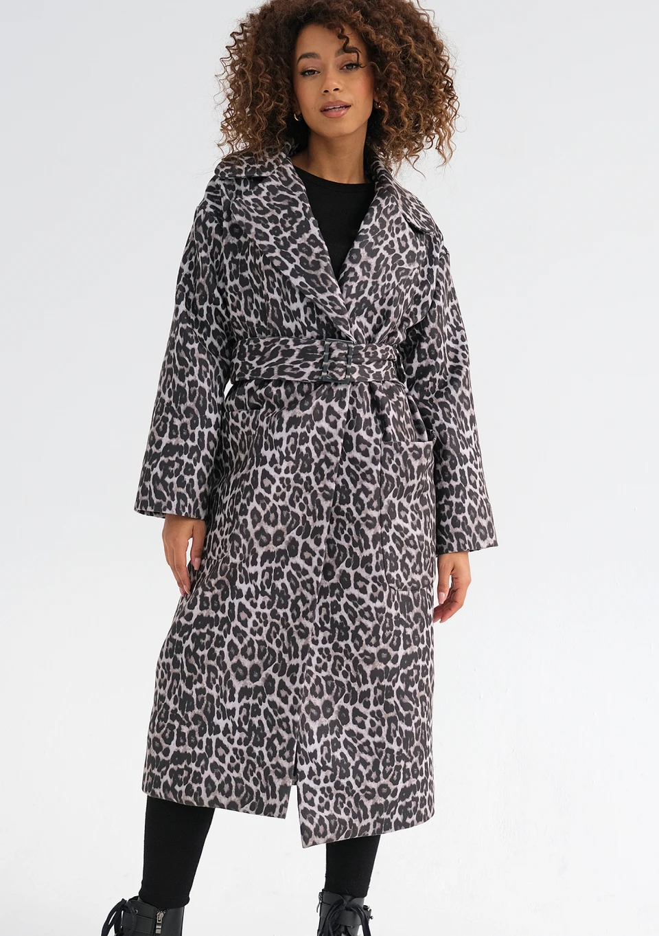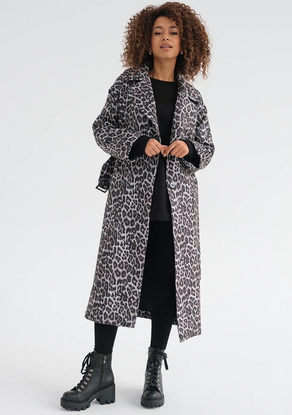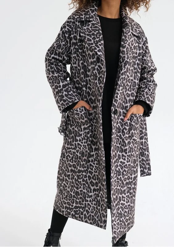 Designerski płaszcz damski z paskiem i kieszeniami. Wykonany z ciepłego flauszu o najmodniejszym wzorze panterki.