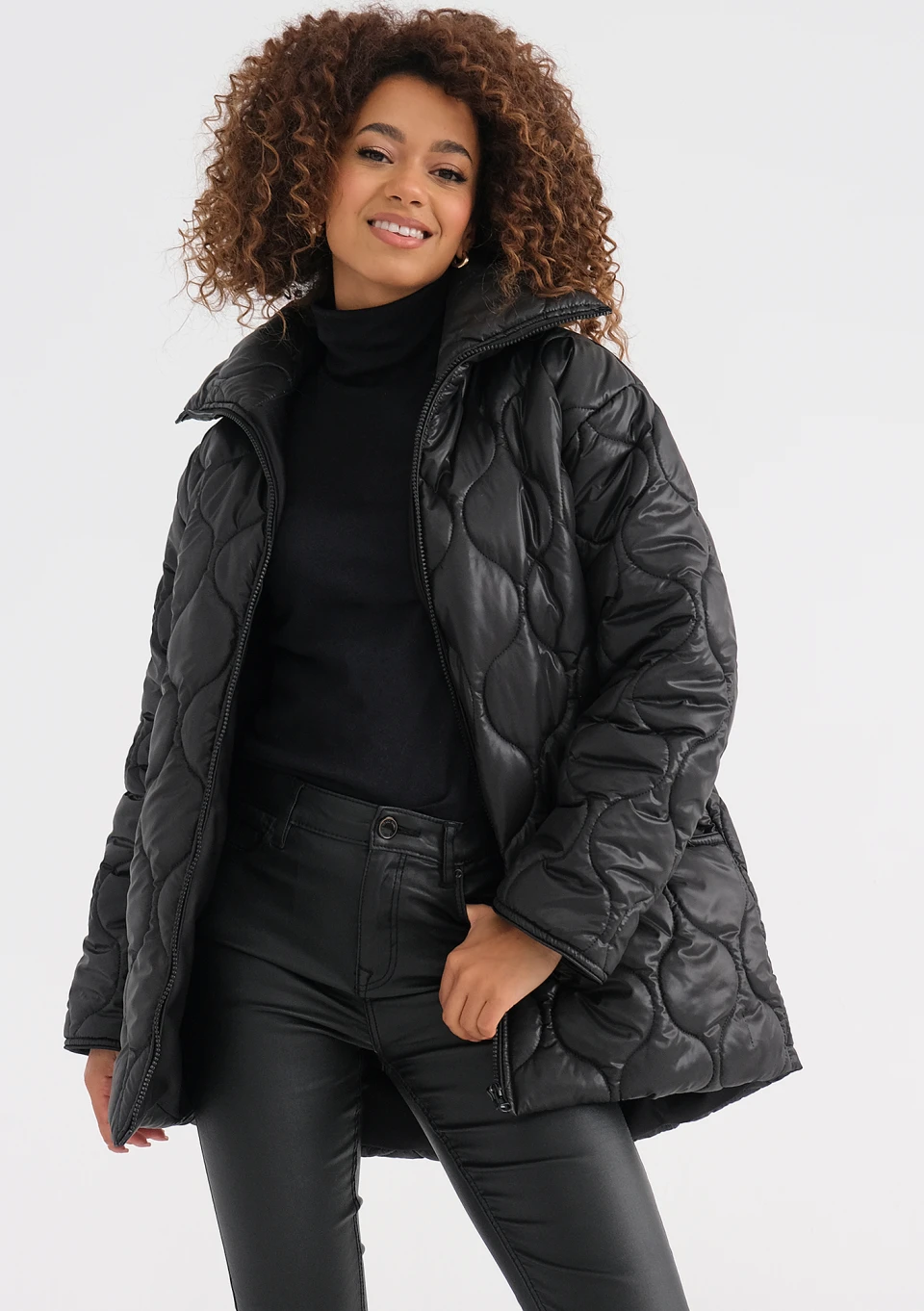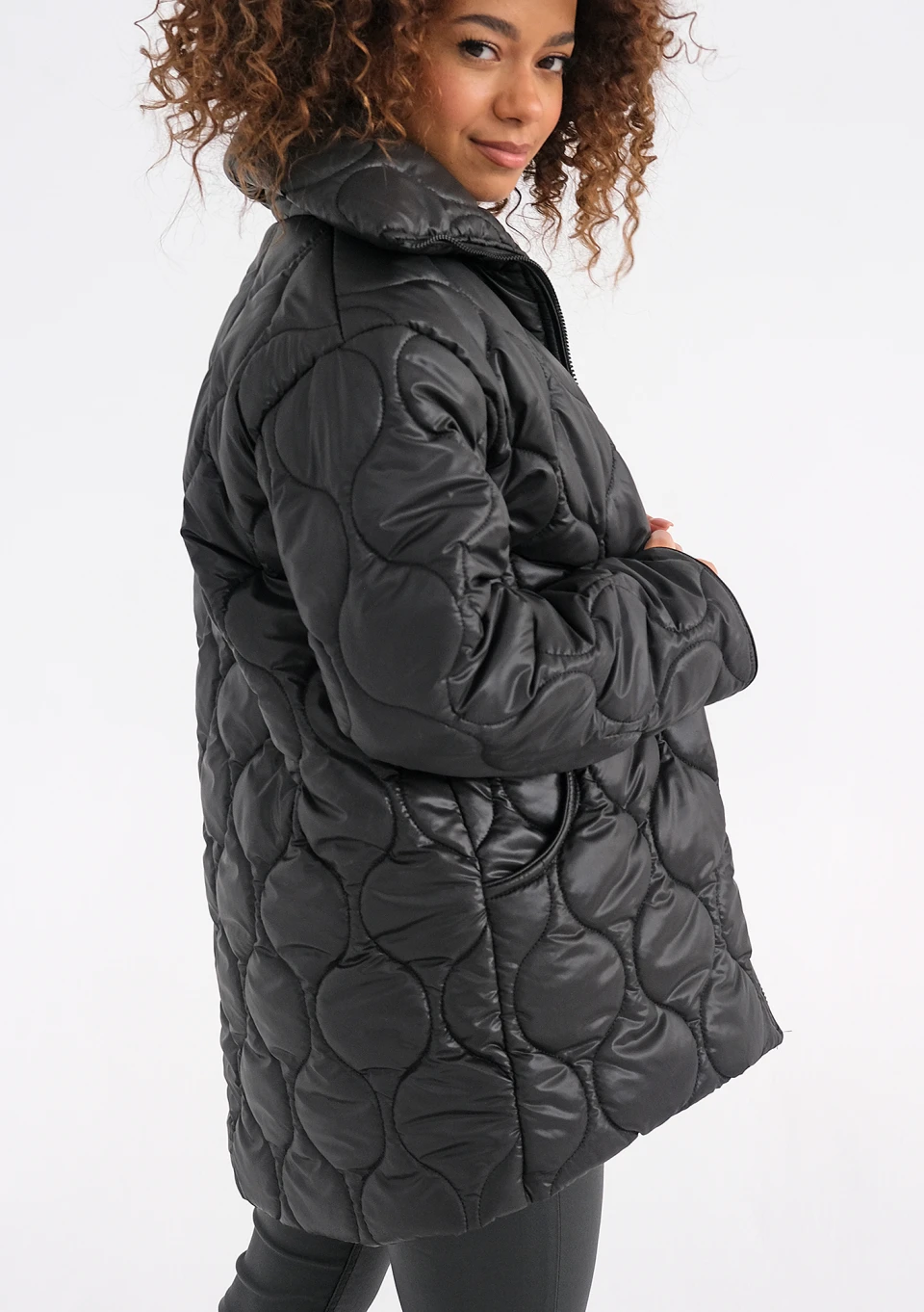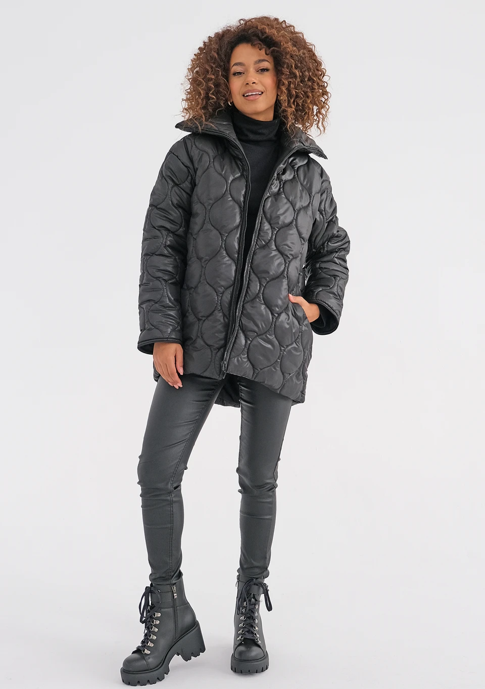 Komfortowo lekka i ciepła kurtka damska pikowana w uniwersalnej czerni. To model funkcjonalnie skrojony, nieco dłuższy z tyłu, z wysoko sięgającym kołnierzem.