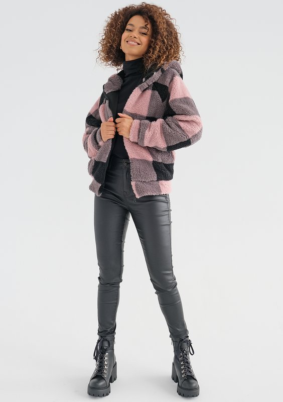 Nulca - Kurtka futerkowa w kratkę Różowa