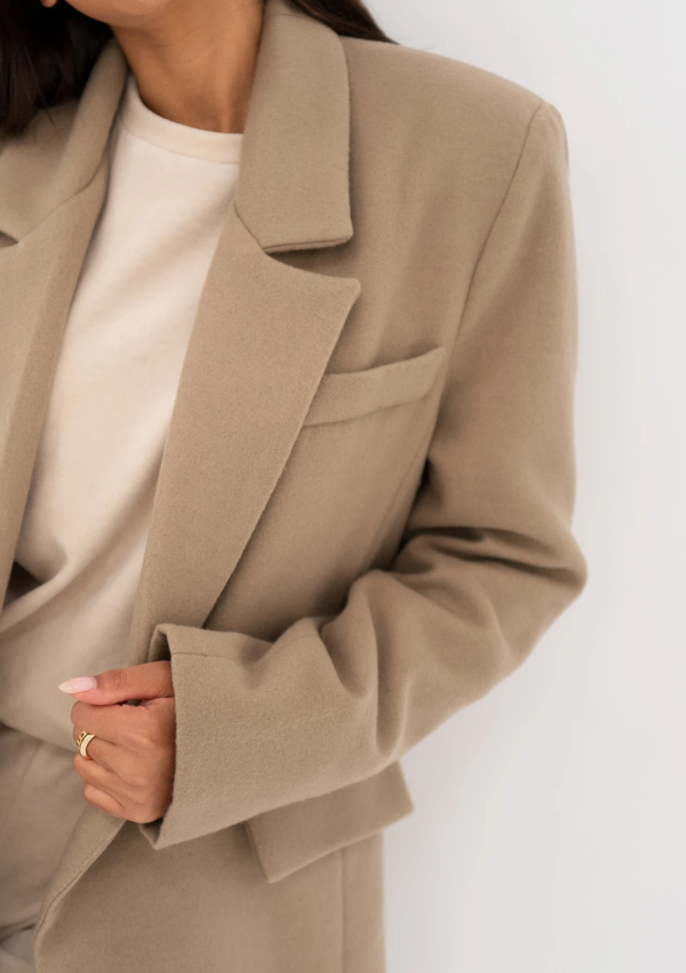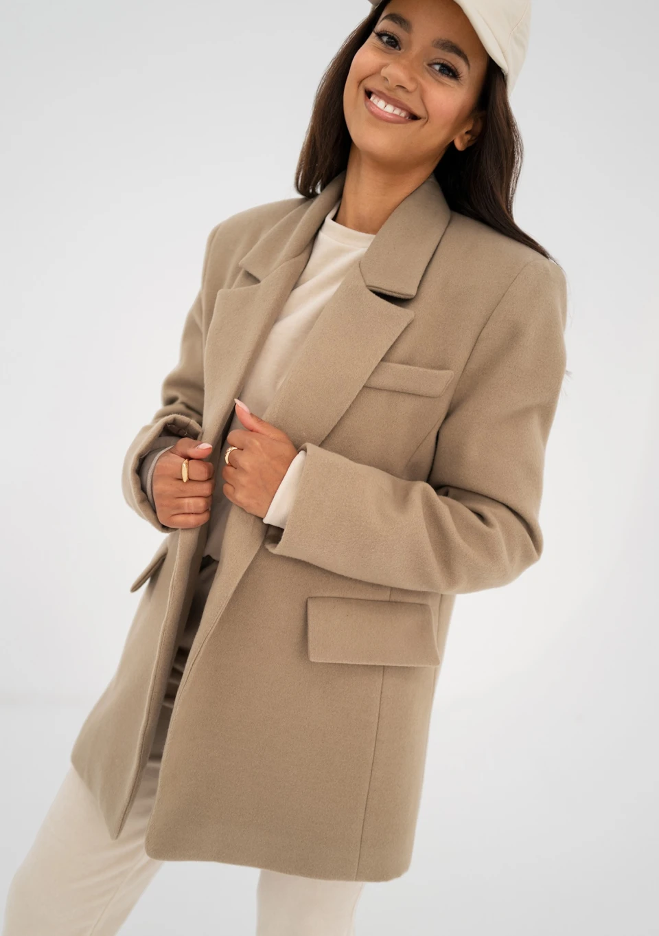 Beżowy płaszcz damski o krótkim fasonie, modnie stylizowany na marynarkę oversize. Wykonany z miękkiego materiału z wiskozą, na ochronnej podszewce.
