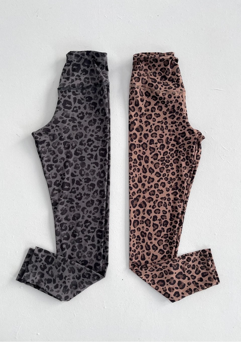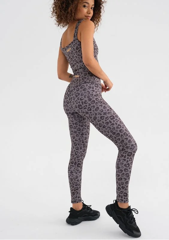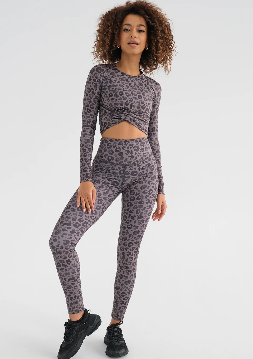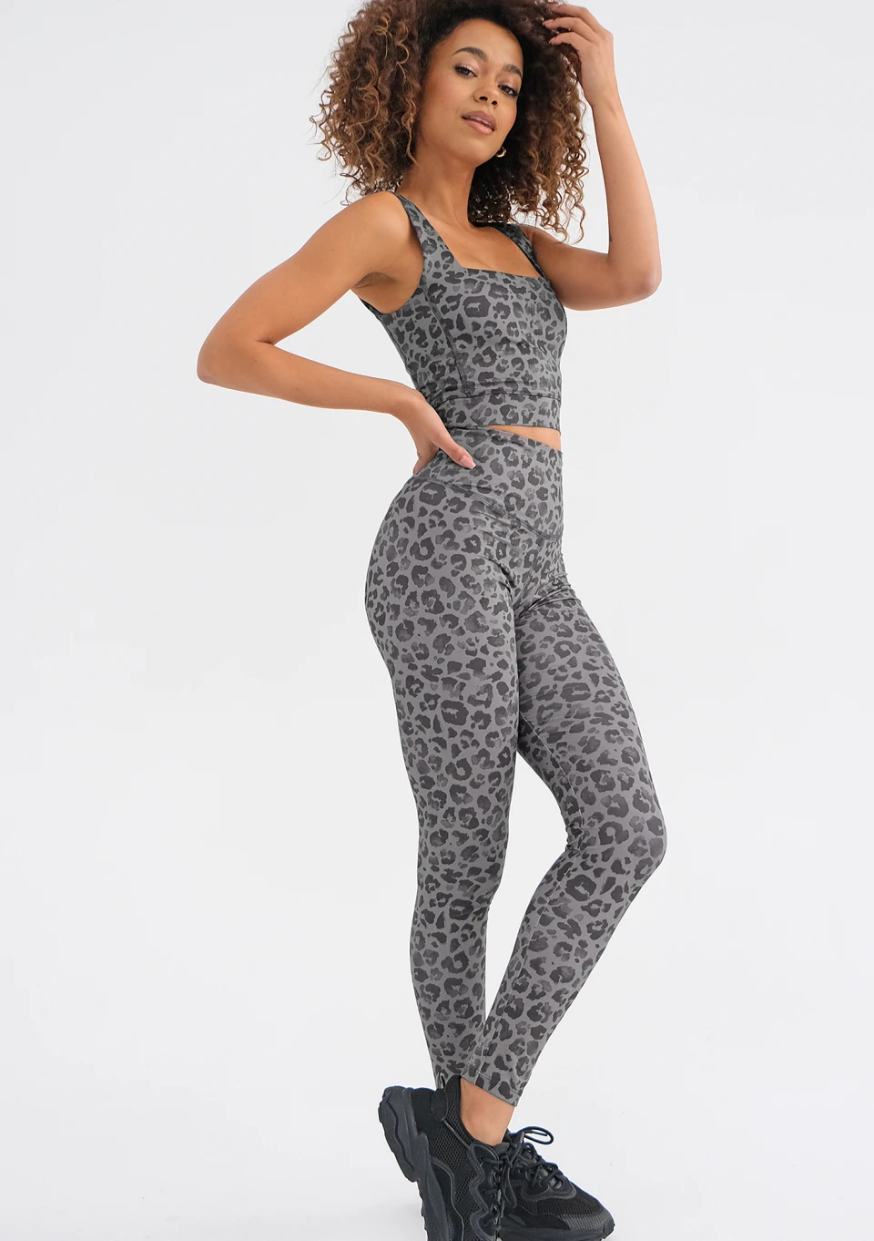 Szare legginsy w panterkę z elastycznej i szybkoschnącej tkaniny. Komfortowo opinają sylwetkę, stabilnie utrzymując się w pasie podczas ruchu.