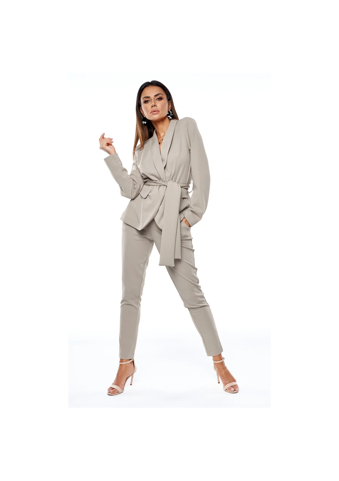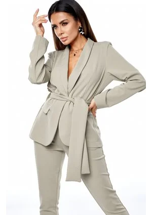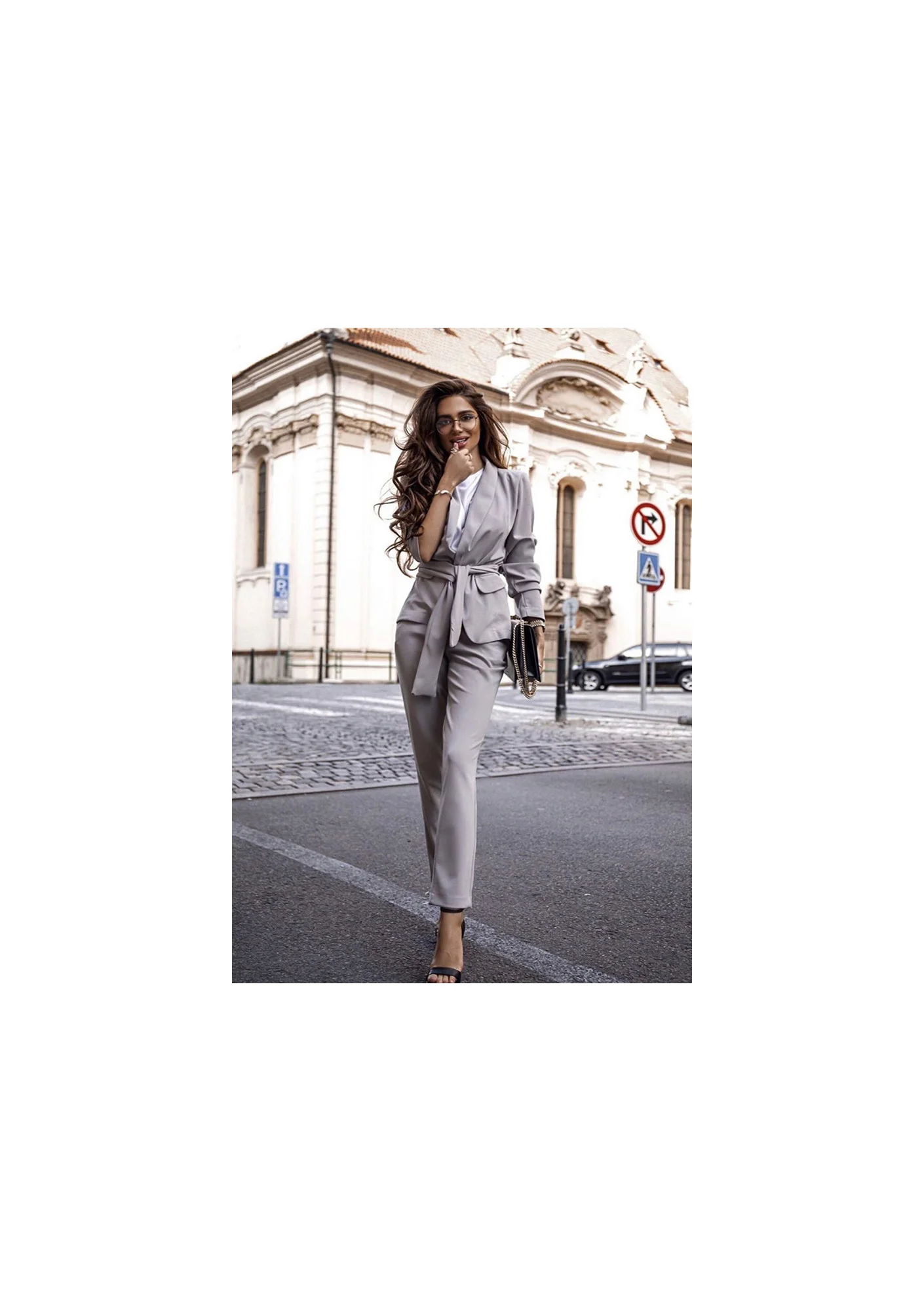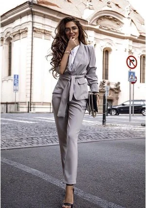Jeśli cenisz styl Natalii Siwiec, z całą pewnością spodoba Ci się prezentowany przez nią klasyczny garnitur w kolorze szarym. Ten niezwykle elegancki komplet doskonale sprawdzi się podczas większych wyjść, kiedy zestawiony z przykuwającą wzrok biżuterią doskonale zastąpi sukienkę koktajlową. Będzie idealny także do pracy, w której obowiązuje dress code lub na spotkania biznesowe, w trakcie których chcesz prezentować się profesjonalnie. Spodnie garniturowe z wyższym stanem i zwężaną nogawką oraz żakiet z szalowym kołnierzem i szerokim paskiem w talii pozwolą Ci czuć się elegancko, a jednocześnie niezwykle kobieco. Zestaw doskonale podkreśla sylwetkę. Garnitur został uszyty z wysokiej jakości materiału z elastycznym wykończeniem, dzięki czemu zapewnia pełen komfort noszenia. Włóż do niego buty na wysokim obcasie i dobierz eleganckie dodatki - Twoja stylizacja będzie olśniewająca!