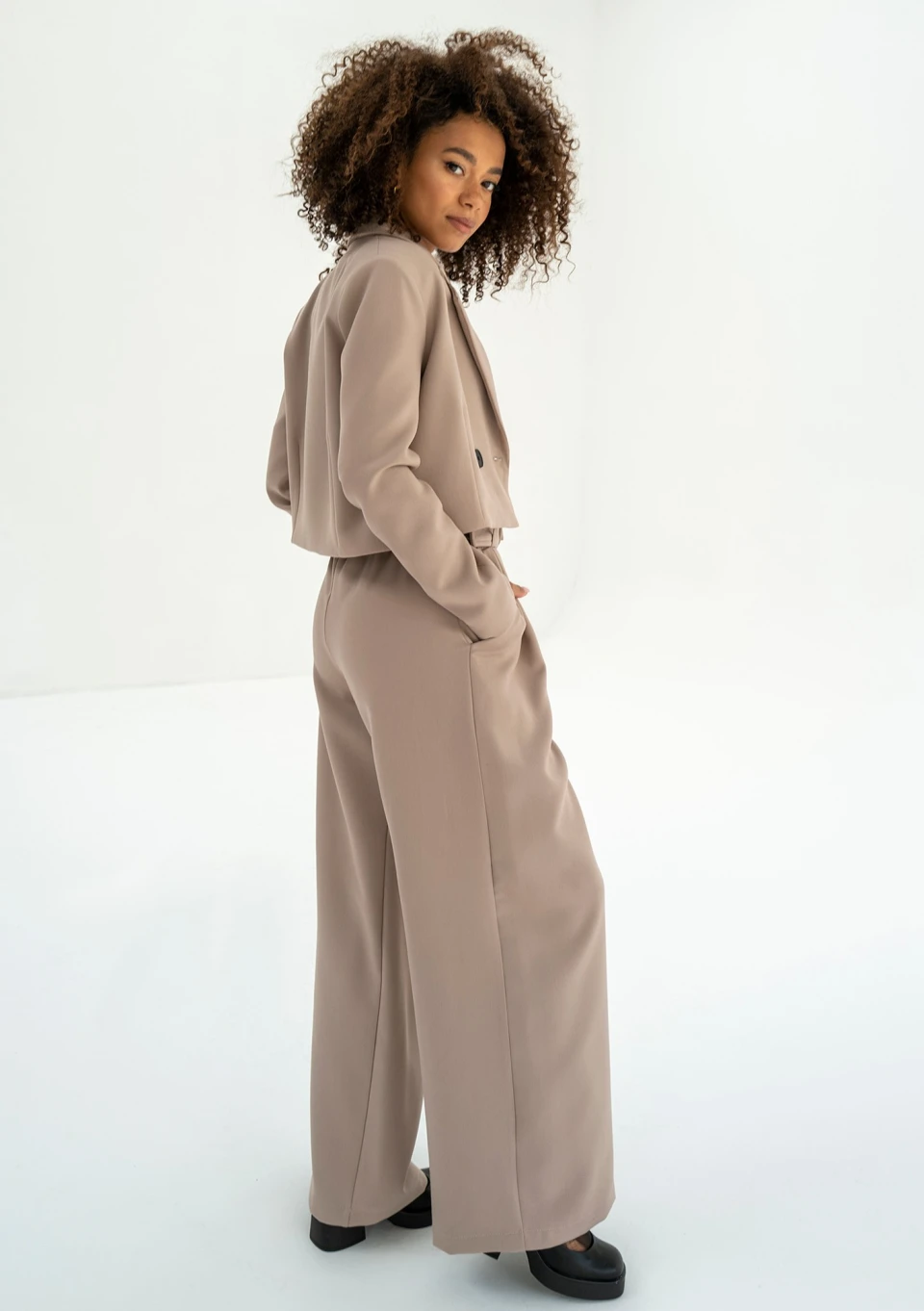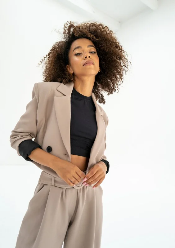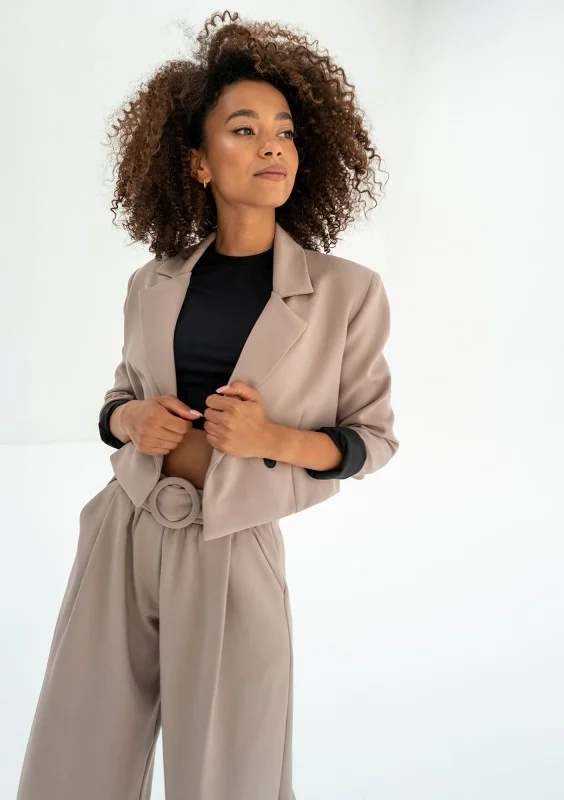 Stylowa, krótka marynarka damska z wiskozą, wykonana w eleganckim, beżowym kolorze. Krój dopasuj do spodni Shani lub spódniczki z paskiem Lili.