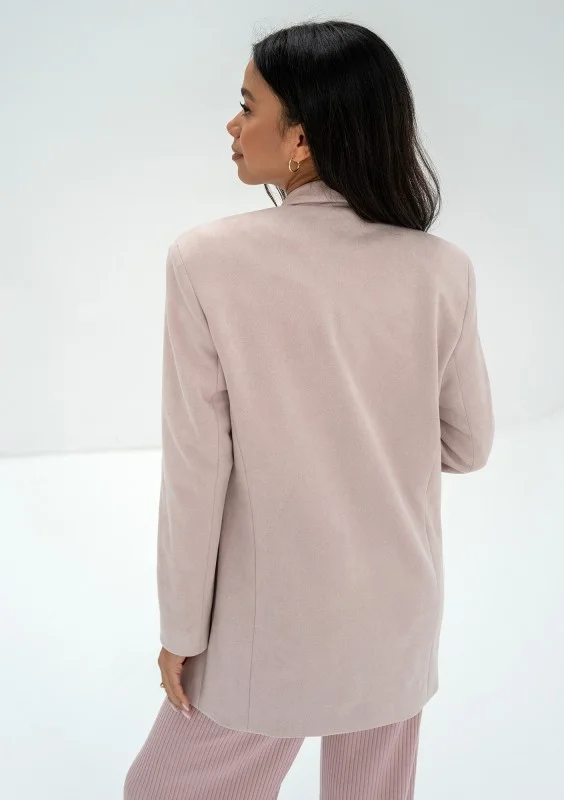 Elegancka marynarka damska w pudrowym kolorze. Modnie stylizowana na oversize, na ramionach wszyte poduszki.