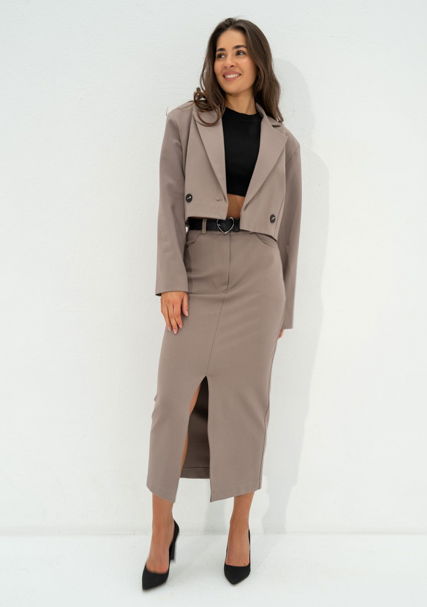 Stylowa, krótka marynarka damska z poduszkami, wykonana w odcieniu latte. Fason dopasuj do spódnicy midi i stwórz elegancki komplet.