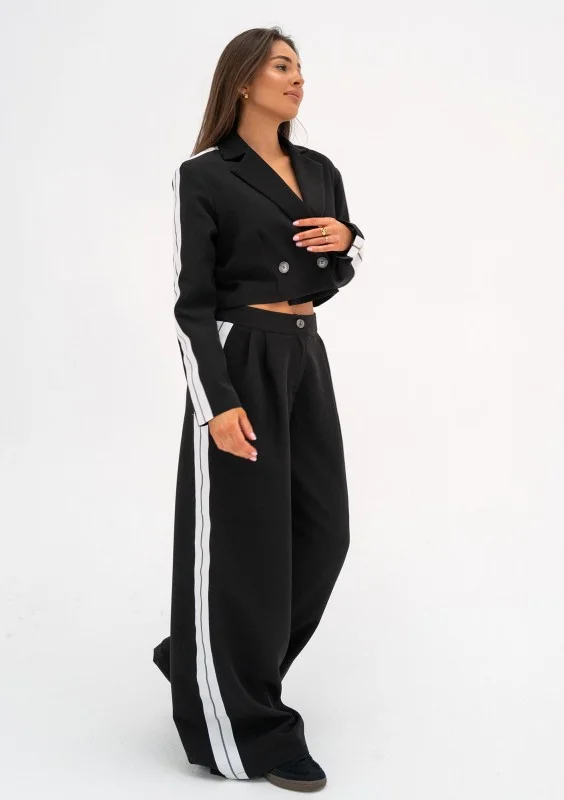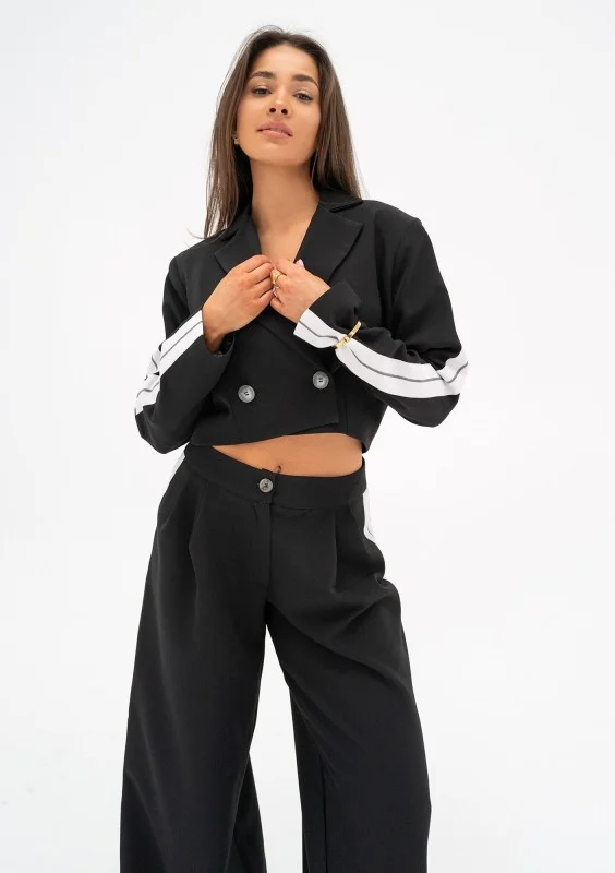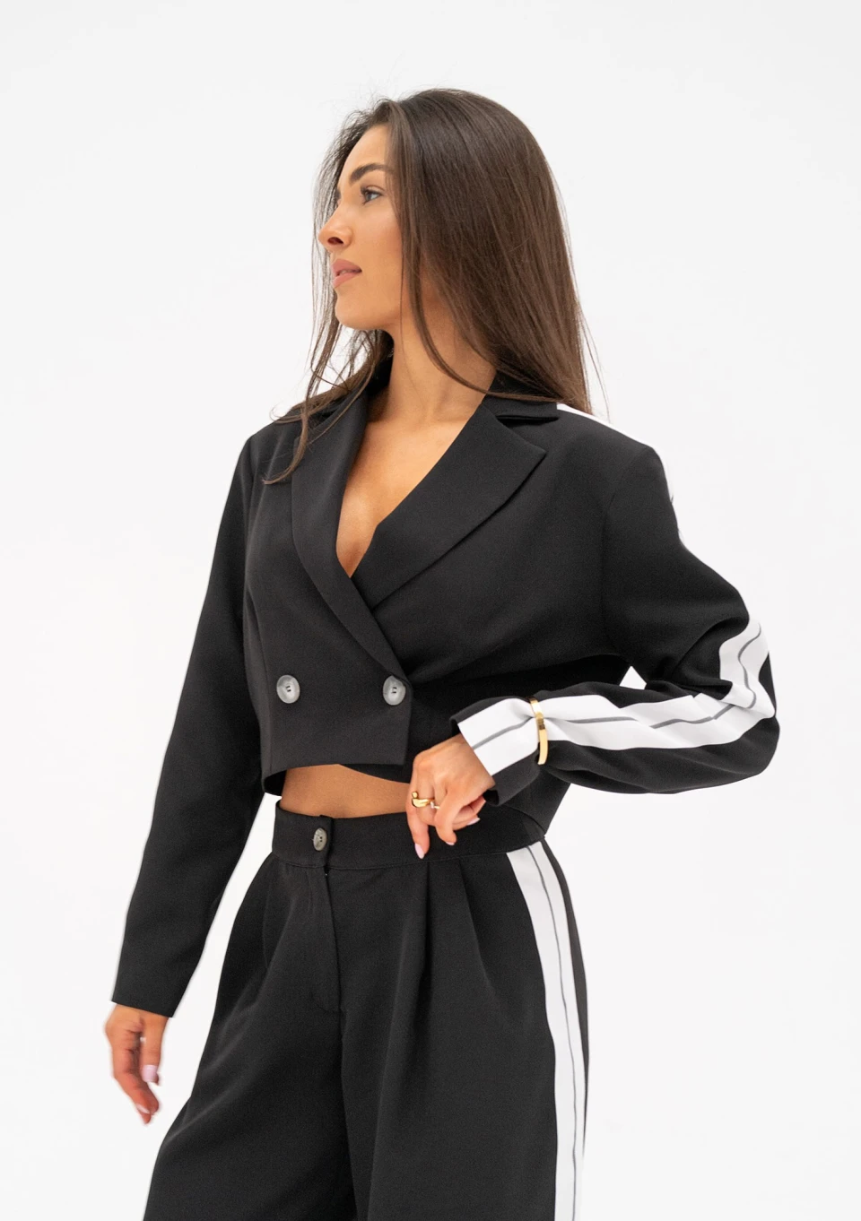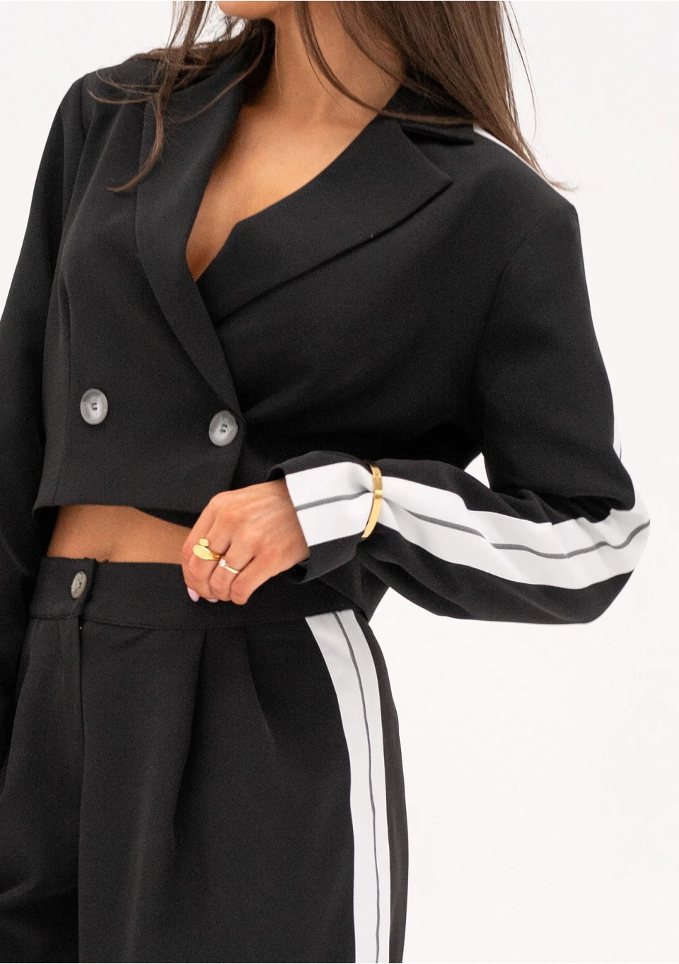 Krótka marynarka o stylowym kroju z poduszkami na ramionach i modnymi lampasami. Wykonana w eleganckim i wszechstronnym, czarnym kolorze.
