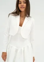 Ten drobny, subtelny żakiet damski o krótkim kroju doskonale zastąpi bolerko, marynarkę czy kardigan, szczególnie jeśli poszukujesz maksymalnie eleganckiego fasonu do sukienki na ważną uroczystość. Doda szyku i uroczystego stylu całemu wizerunkowi, a także zasłoni ramiona stosownie do chwili i pogody. Wykonany z gładkiego materiału, będzie idealnym dodatkiem do kreacji o różnych fakturach tkanin. Na okazje półformalne możesz nosić go wraz ze spodniami. W ofercie znajdziesz dedykowane, modne spodnie Azari z szeroką nogawką, a całość zapewni Ci wyjątkowy look na codzienne spotkania. Prezentowany żakiet Iris jest dostępny w wielu kolorach, głównie pastelowych - w sam raz, byś dopełniła nim elegancką sukienkę na wesele, chrzciny, urodziny, przyjęcie komunijne i wykreowała outfit na wiele innych okazji.
