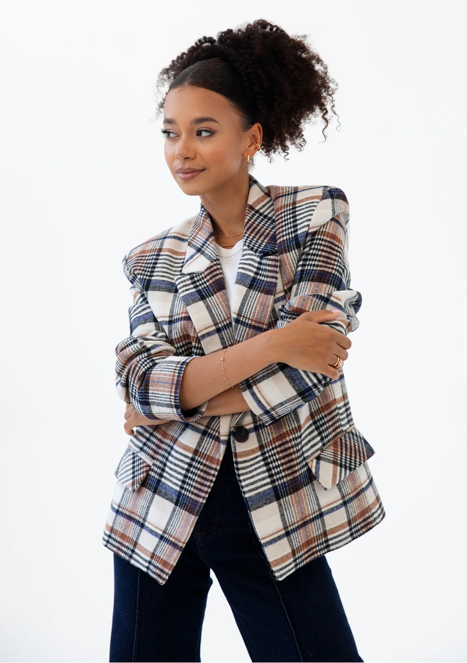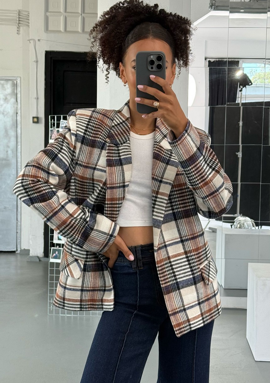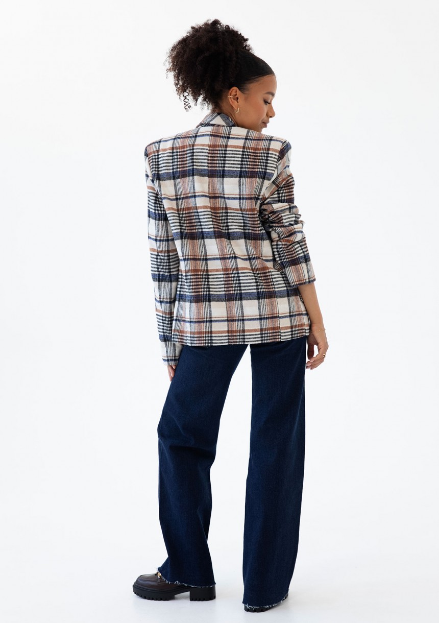 Stylowa marynarka damska oversize z miękkiej flaneli z bawełną. Zdobiona wzorem kraty w eleganckiej kolorystyce. Poduszki na ramionach nadają efektownej linii.