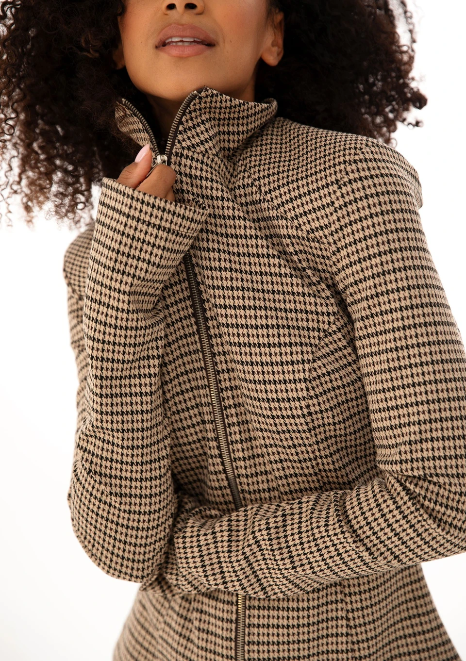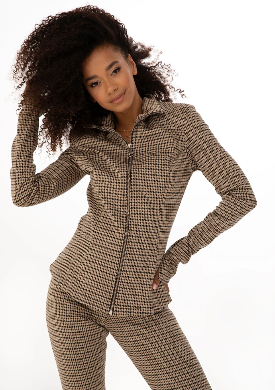 Vera to nietuzinkowy fason! Oto wyjątkowa hybryda wygodnej bluzy i szykownej marynarki. Jest wygodna i funkcjonalna dzięki zamkowi, ale jednocześnie wyróżnia się eleganckim, subtelnym wyprofilowaniem i poduszkami na ramionach, nadającymi jej stylowego charakteru marynarki. Wykonana jest z miękkiego, przyjemnego w dotyku materiału. Dla osób ceniących kompletne zestawy, dostępne są pasujące spodnie Prime o identycznym wzorze pepitki, co ułatwia stworzenie spójnej stylizacji.