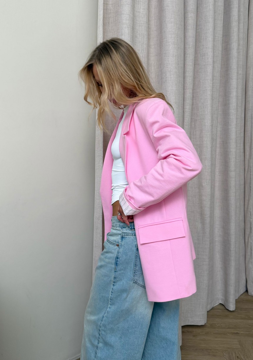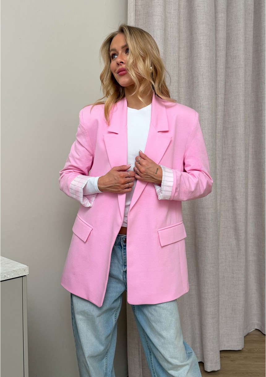 Różowa marynarka damska z bawełny o modnym kroju oversize. Słodka i wyrazista! Podszyta ochronną, śliską tkaniną w prążki.