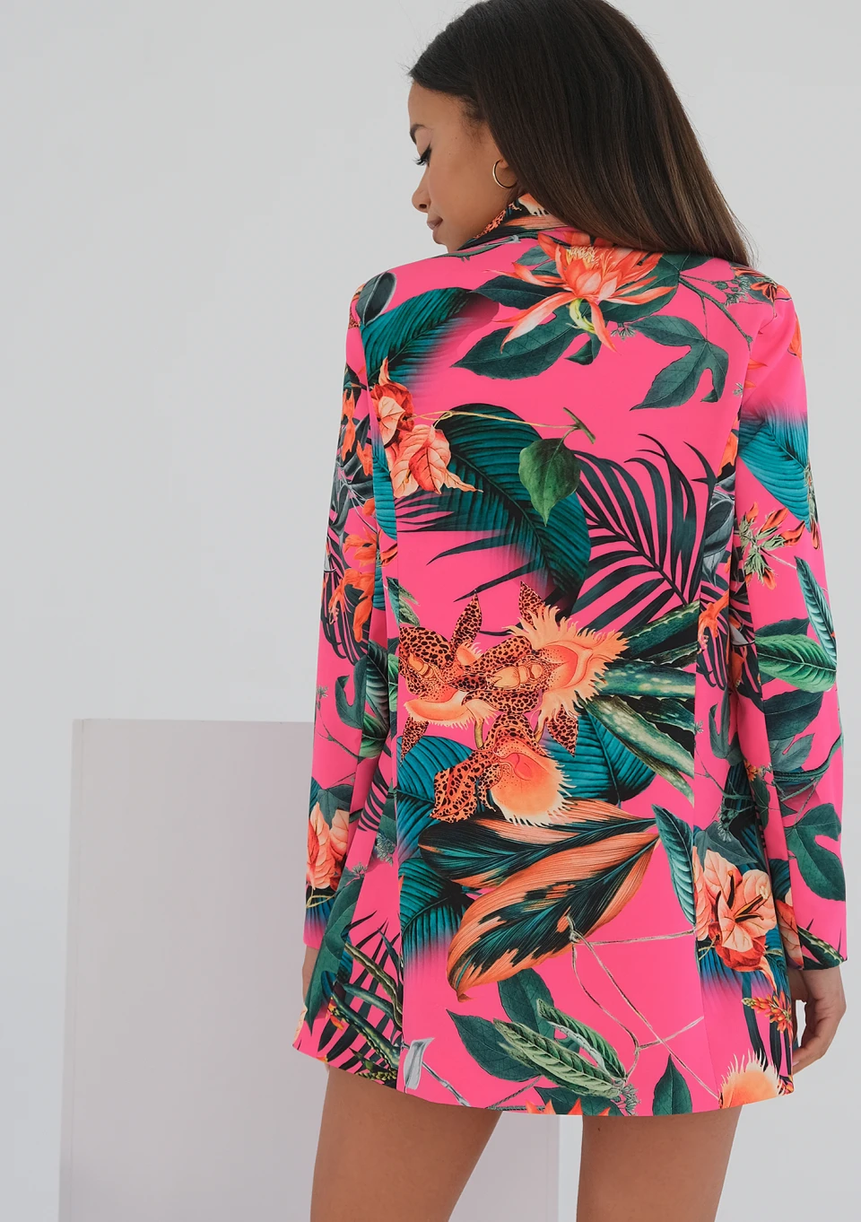Różowa marynarka we wzór stanowi wyrazisty model, toteż nie musisz zakładać do niej wielu dodatków. Świetnie ożywi gładkie, jednolite kolorystycznie topy. Możesz pozwolić sobie na najmodniejsze, krótkie braletki, a ich długość równoważyć szortami z wyższym stanem. Marynarka utworzy ciekawy komplet z szortami o tym samym deseniu, które znajdziesz w aktualnej kolekcji, również w rozmiarach XS – L. Ze względu na pomarańczowe kwiaty i ciepłe barwy marynarki, polecamy złote akcesoria czy biżuterię w roli dodatków. Marynarka posiada długi krój sięgający poniżej bioder i jest przygotowana z myślą o kobiecej sylwetce. Od spodu ubranie posiada śliską podszewkę ochronną.