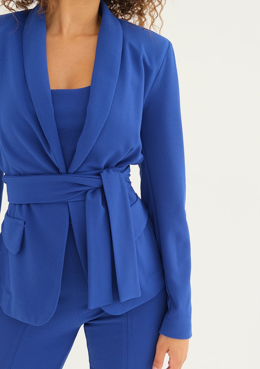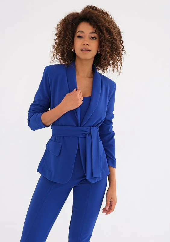 Kobaltowa marynarka z eleganckim wiązaniem, które świetnie podkreśla wcięcie. Majstersztyk pod względem koloru i fasonu, w sam raz do niebanalnych stylizacji na ważne okazje.